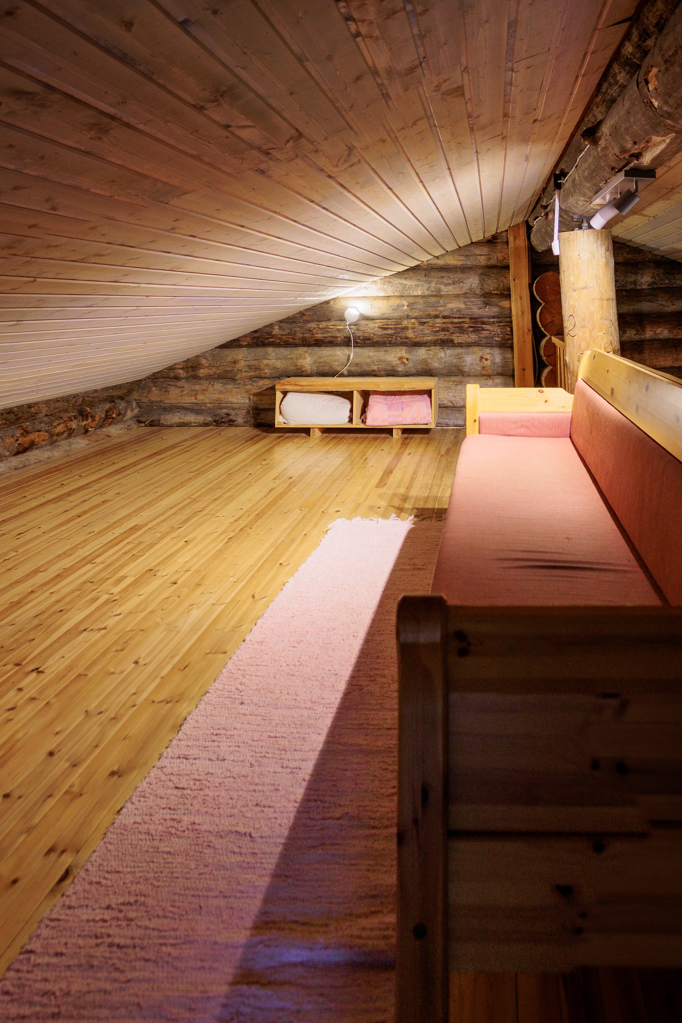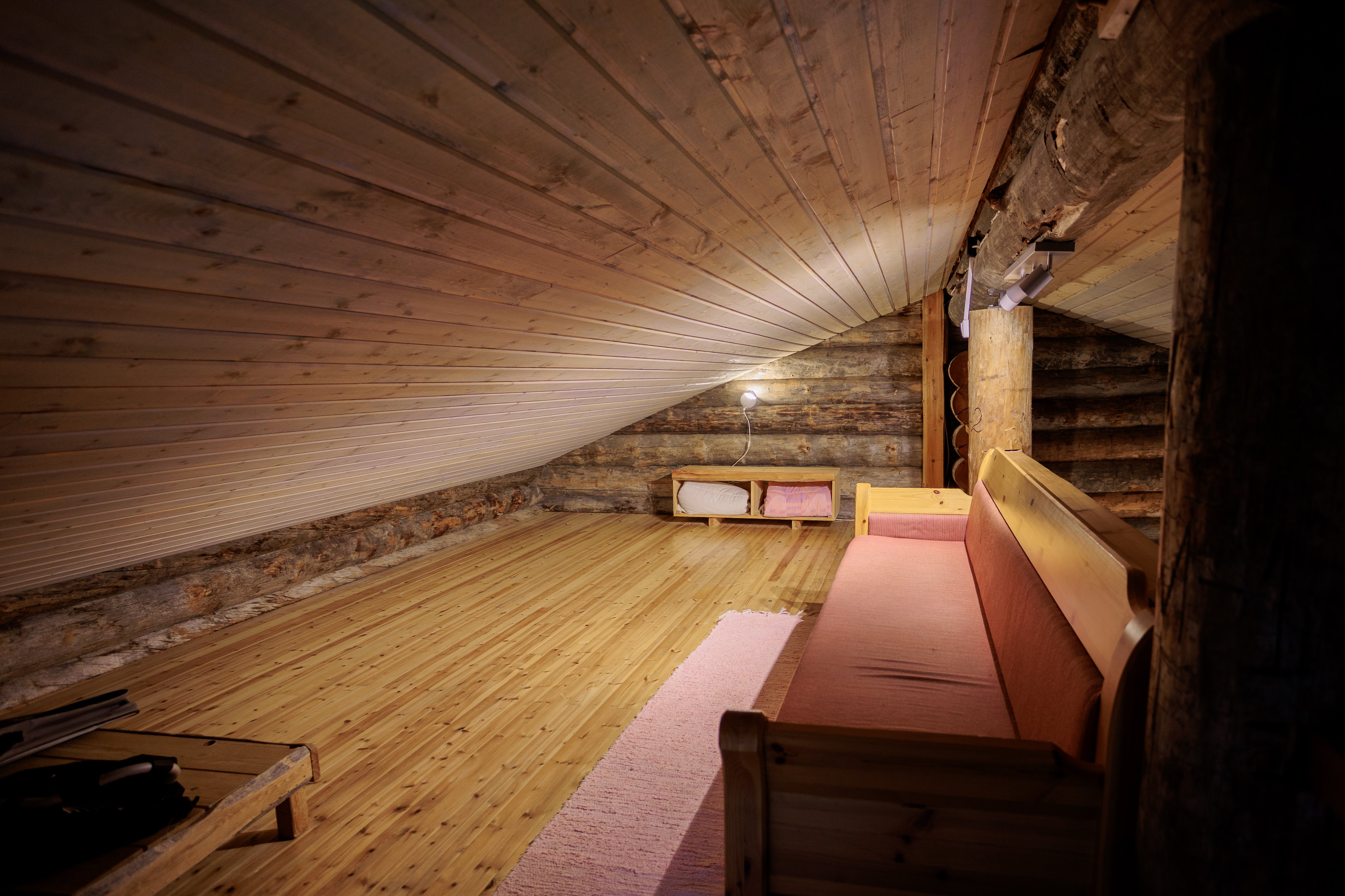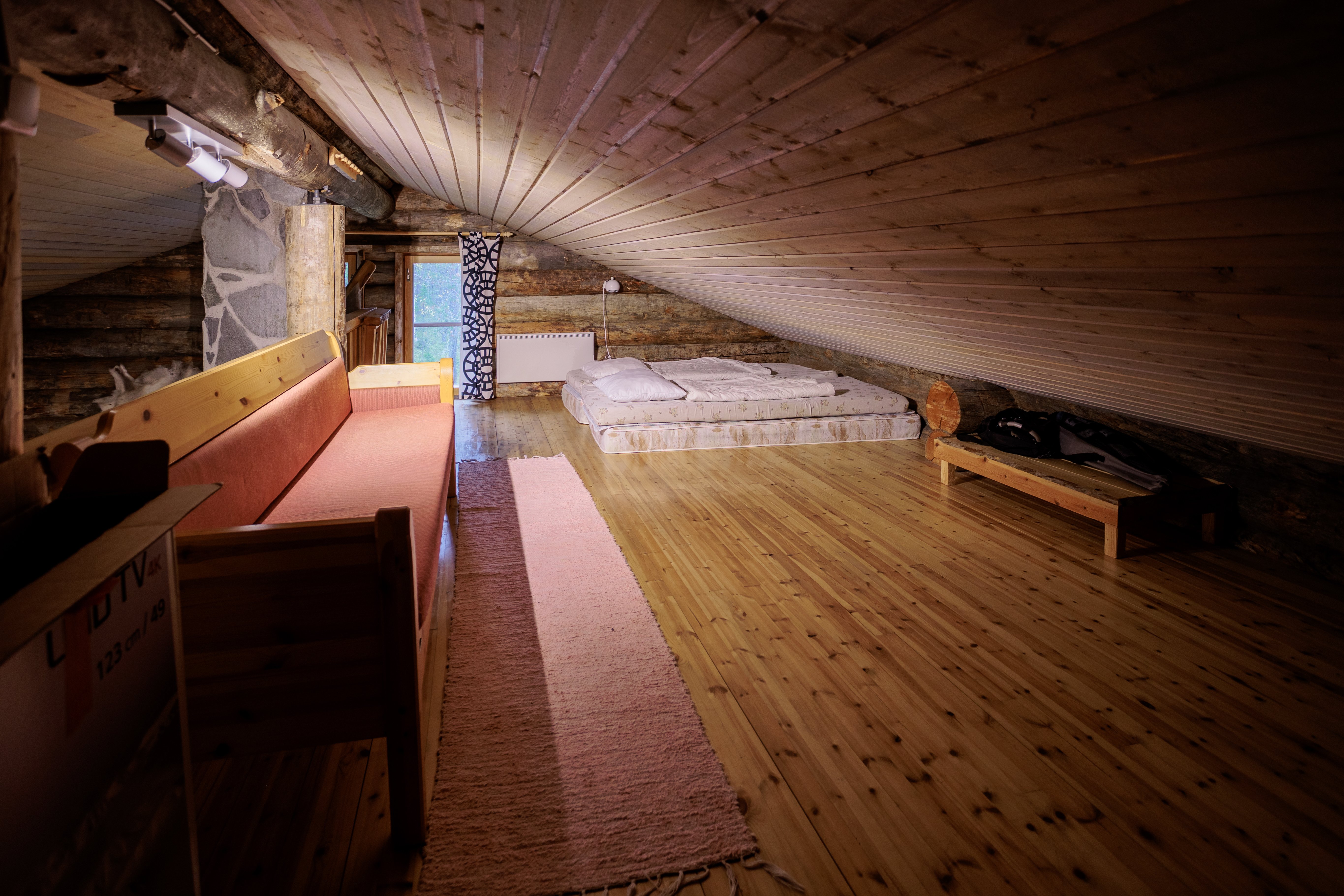 Lisää majoitus ja makuutilaa löytyy suurehkolta parvelta. Parvi on koko mökin mittainen ja majoittaa Lapin matkaajia mukavan määrän lisää. Eteisessä sijaitsee kuivauskaappi.