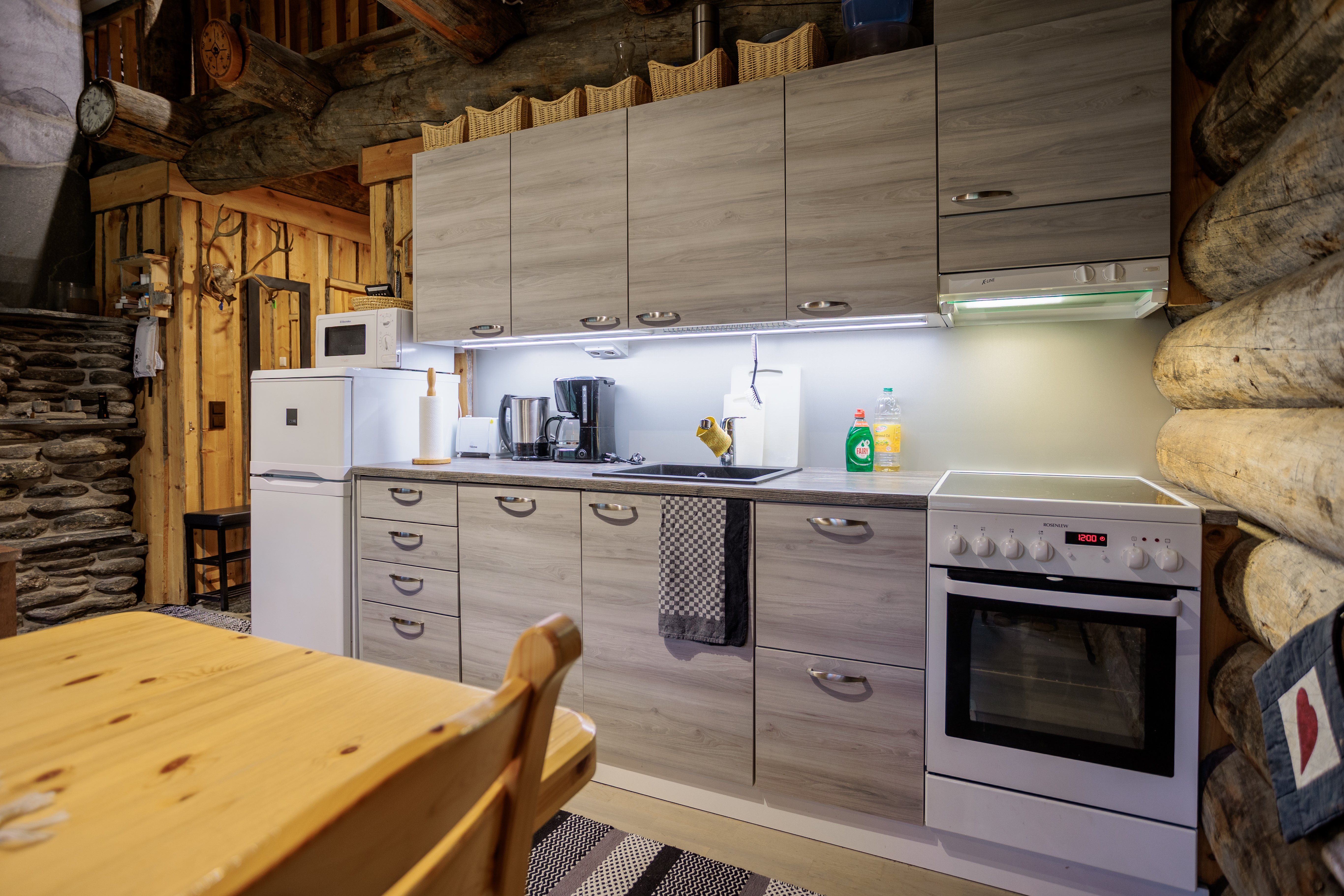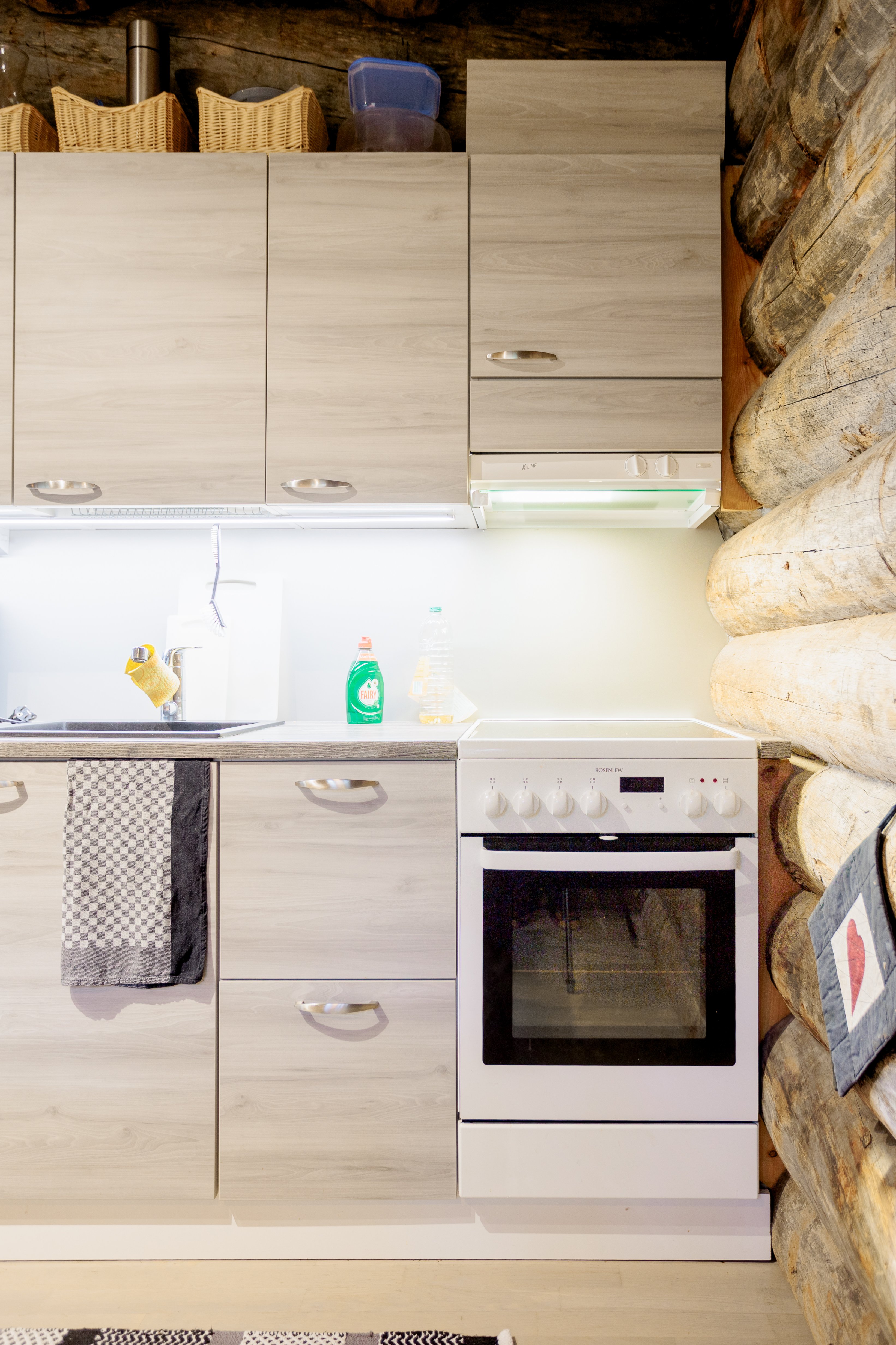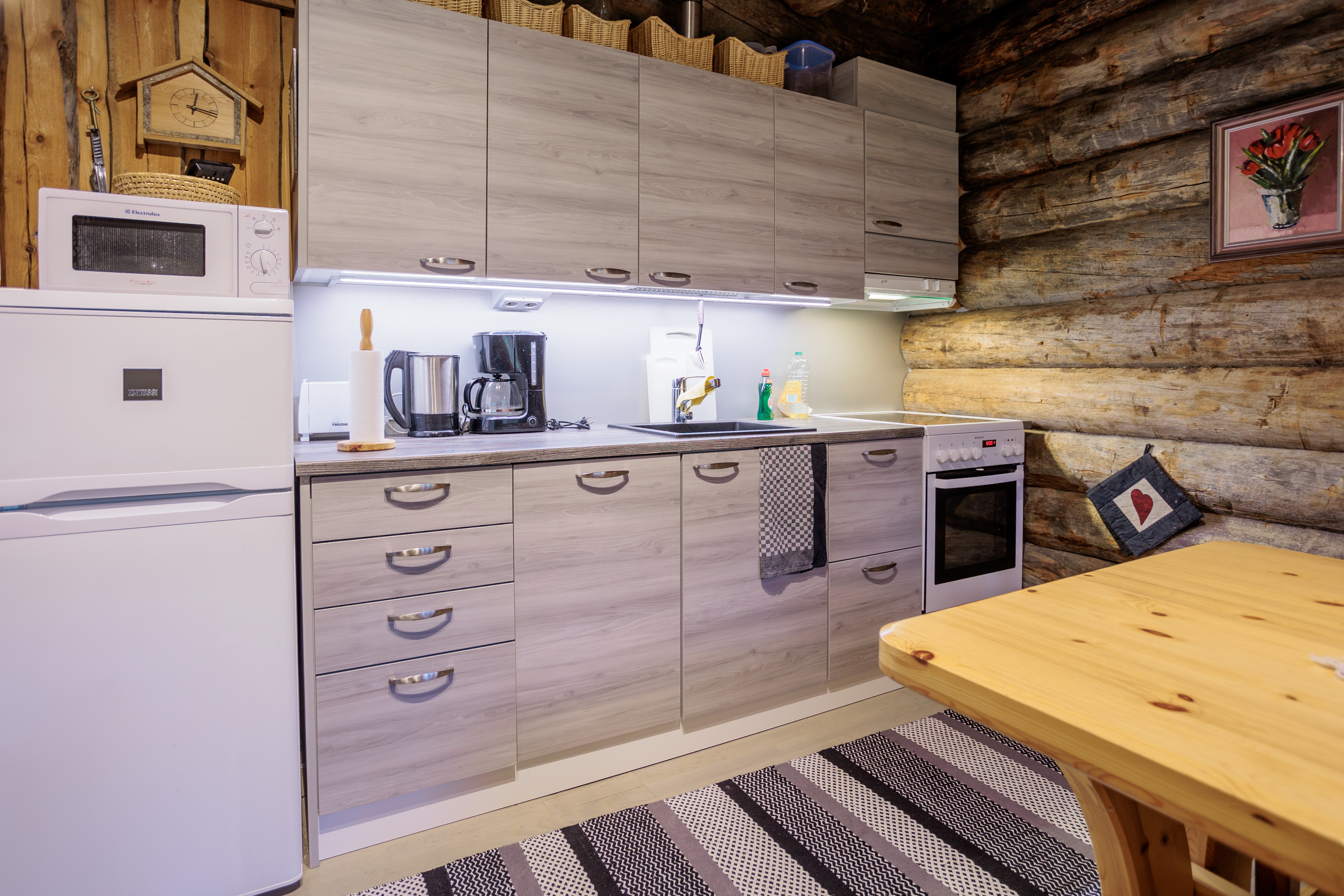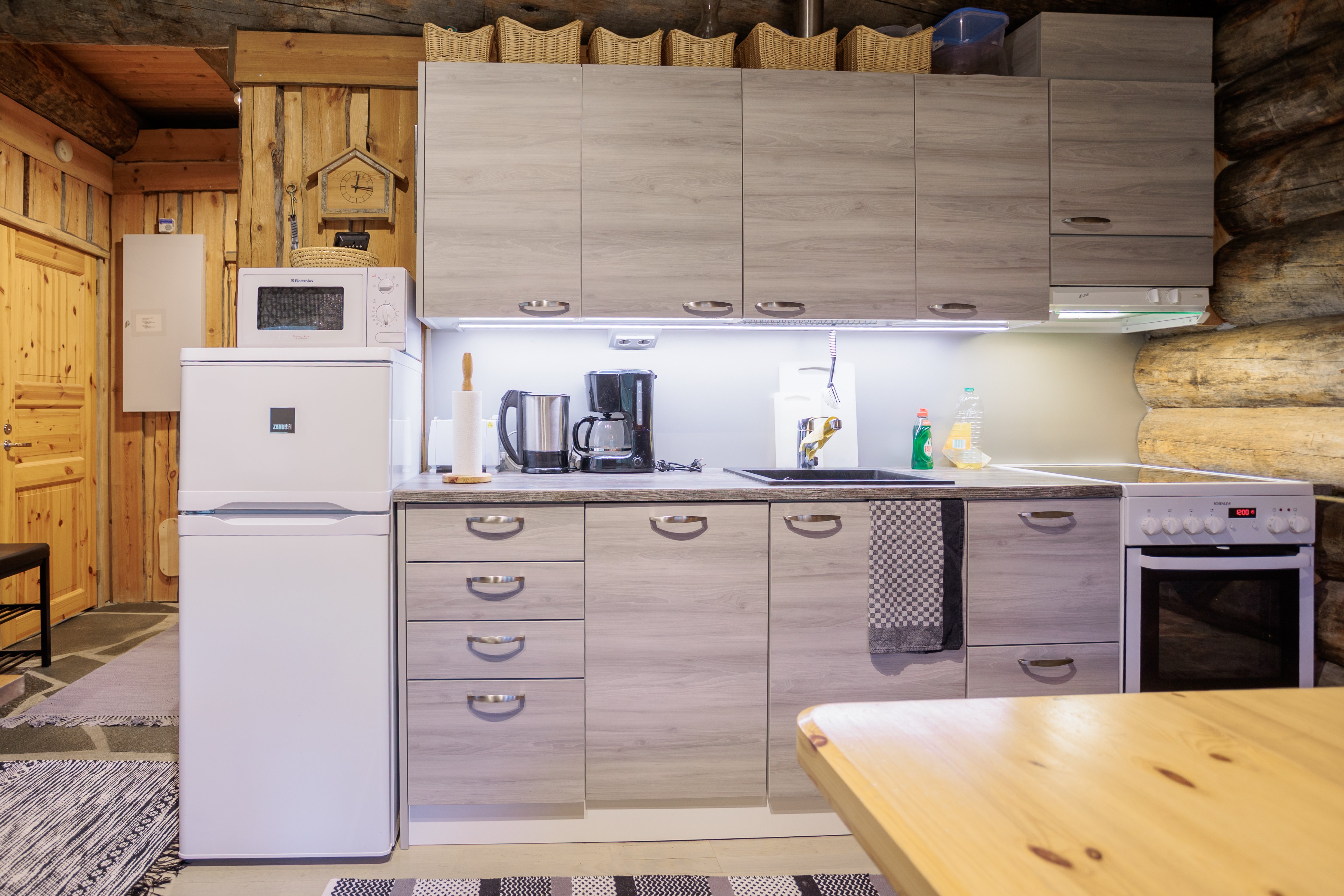 Tässä tunnelmallisessa loma-asunnossa on tunnelmallinen ja remontoitu keittiö. Keittiö sulautuu kauniisti harmaan kelon tuomaan rauhalliseen tunnelmaan. Keittiö on hyväkuntoinen ja siitä löytyy kaikki tarvittava lomaherkkujen valmistamiseen.
