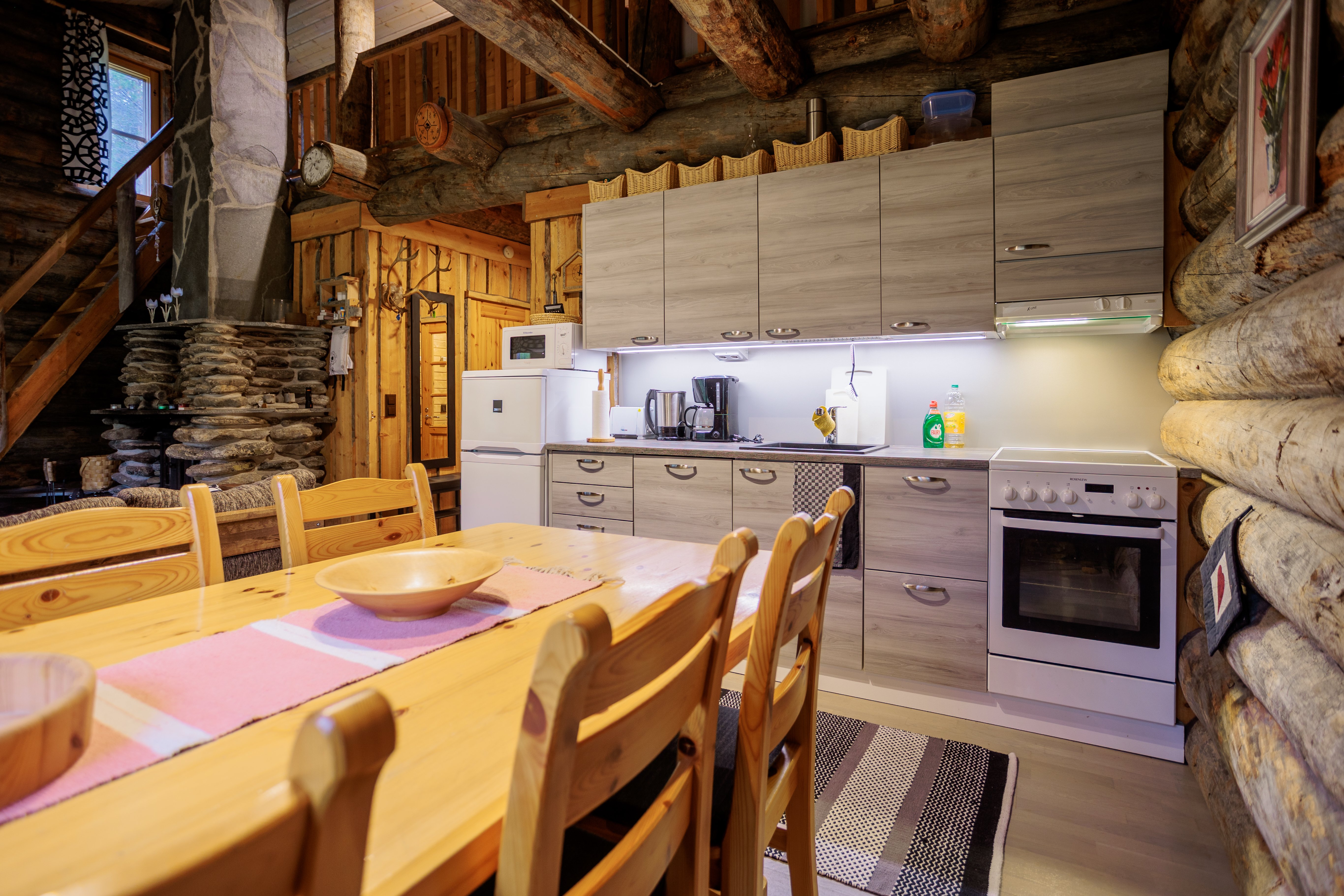 Mökin sydän on avara tupa, jossa luonnonkivinen takka luo lämpöä ja tunnelmaa talvi-iltoihin. Keittiö on käytännöllinen ja hyväkuntoinen, tarjoten riittävästi tilaa herkullisten aterioiden valmistamiseen. Alakerran makuuhuone on rauhallinen paikka lepoon, ja parvi tarjoaa lisätilaa vierailijoille.