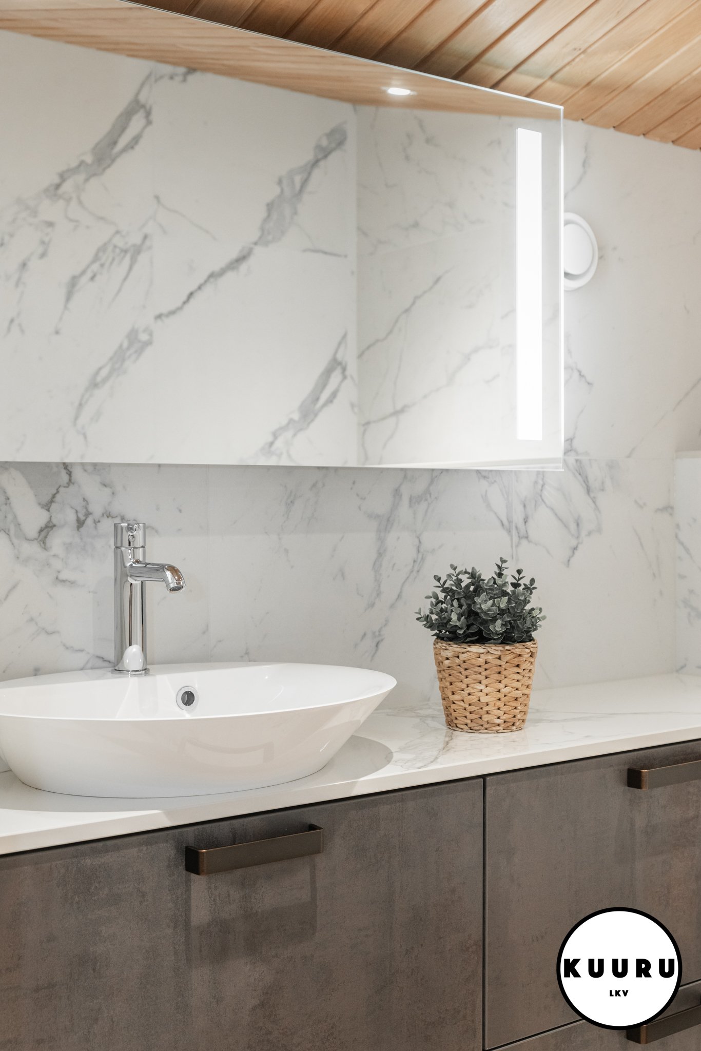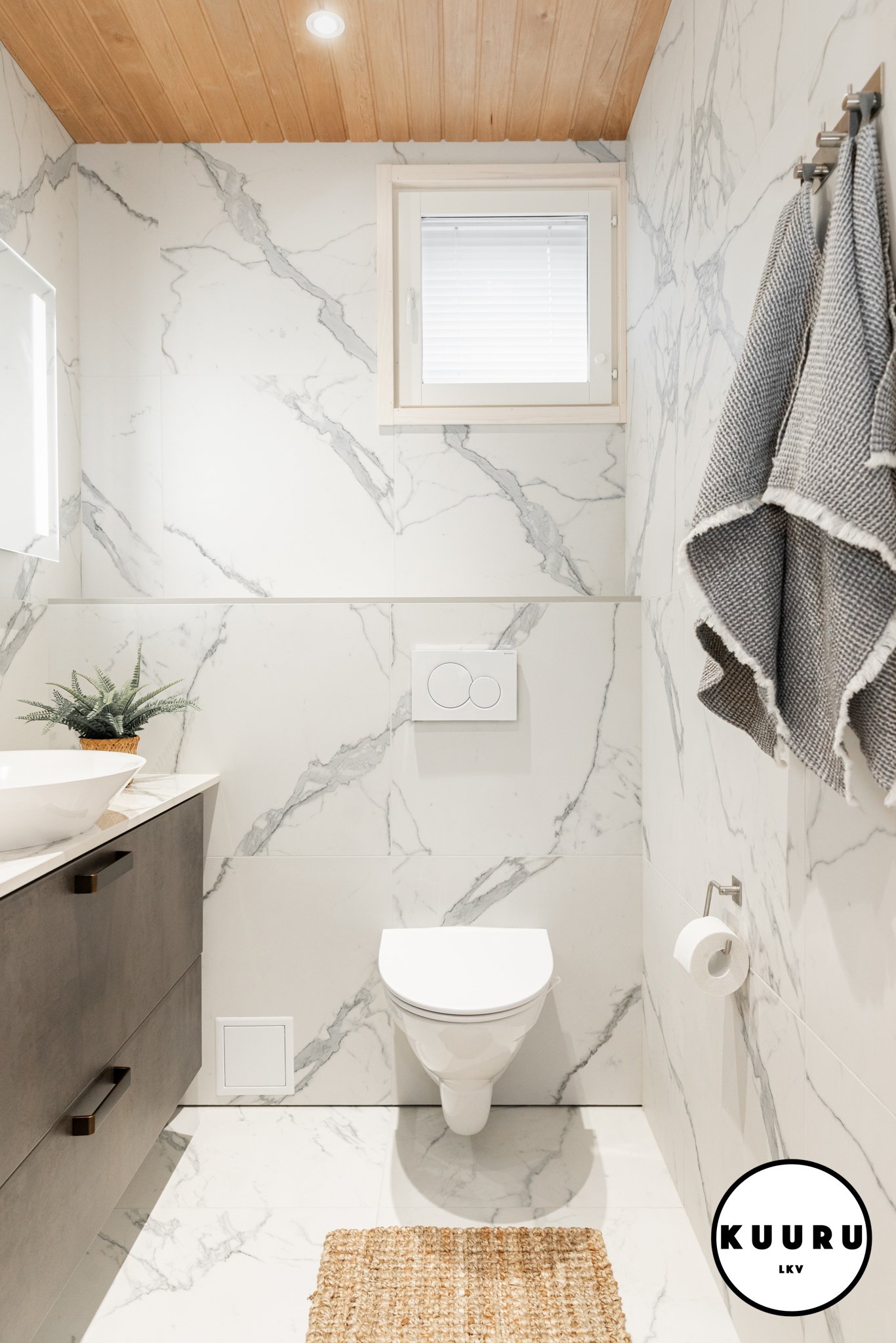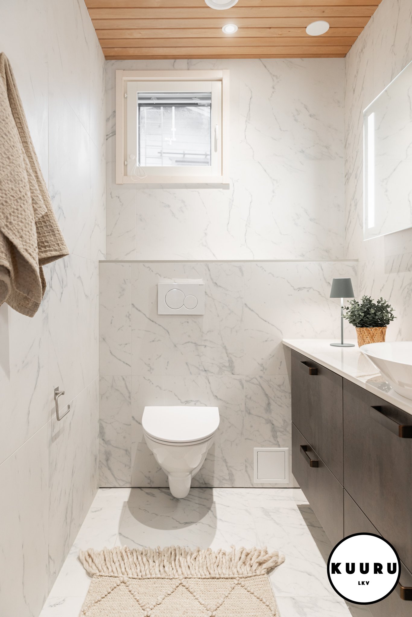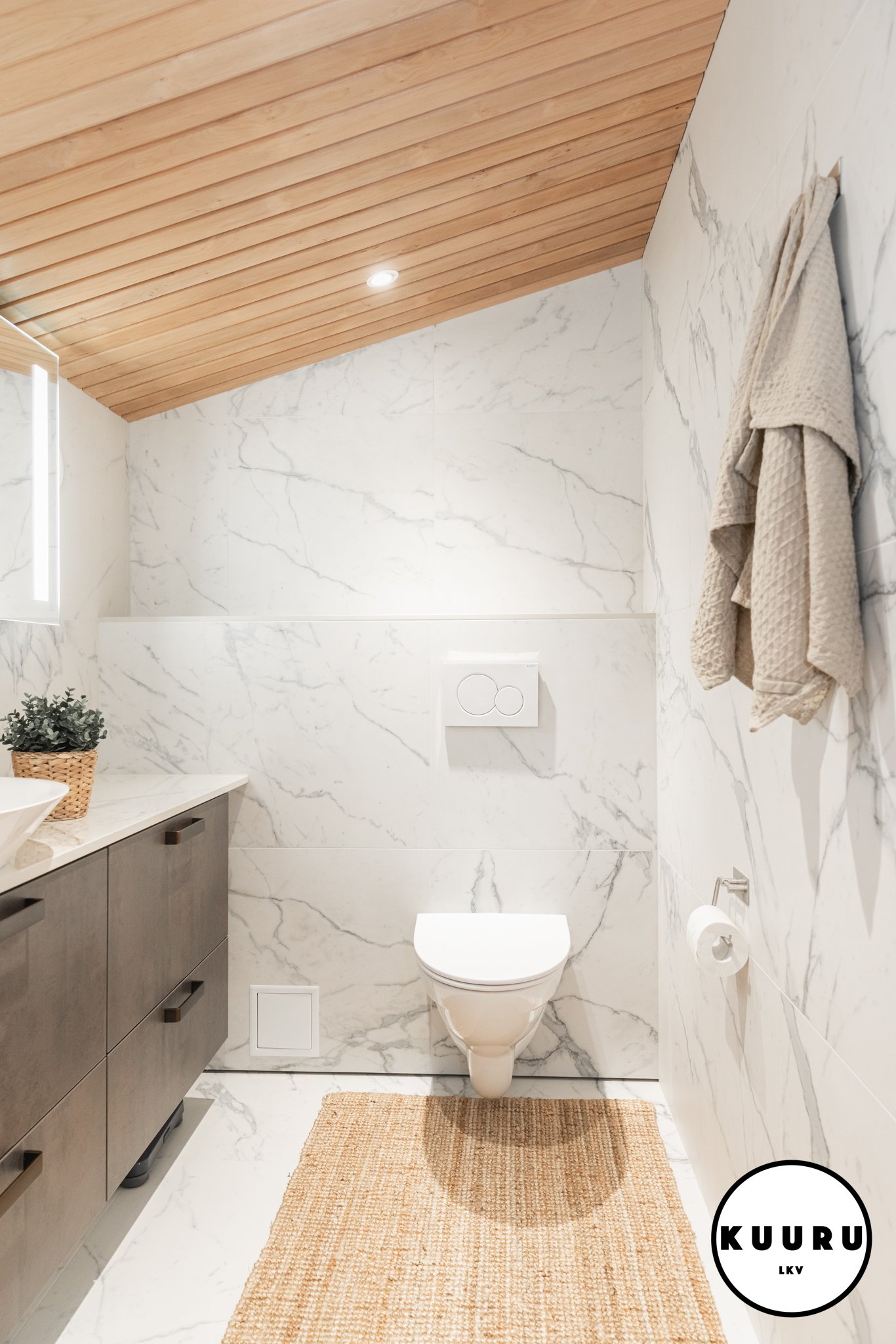 Valoisa ja raikas wc, jossa marmoria mukailevat pinnat ja lämminsävyinen puukatto luovat ylellisen hotellitunnelman. Pehmeä valaistus ja selkeälinjainen kalustus tekevät tilasta viimeistellyn ja helppohoitoisen. Arkea helpottaa, että tällaisia wc-tiloja on loma-asunnossa yhteensä kolme kappaletta: kaksi alakerrassa ja yksi yläkerrassa. Käytännöllistä mukavuutta isommallakin porukalla lomaillessa.