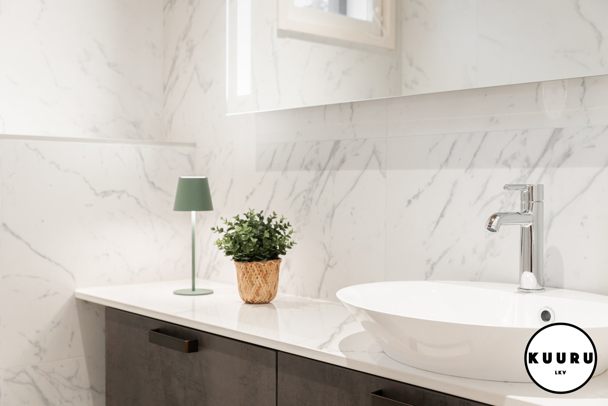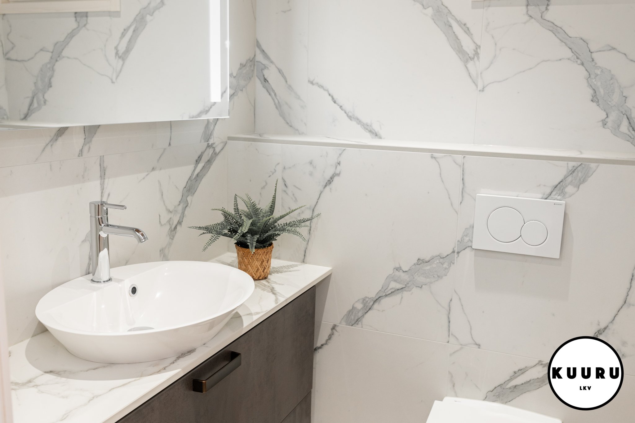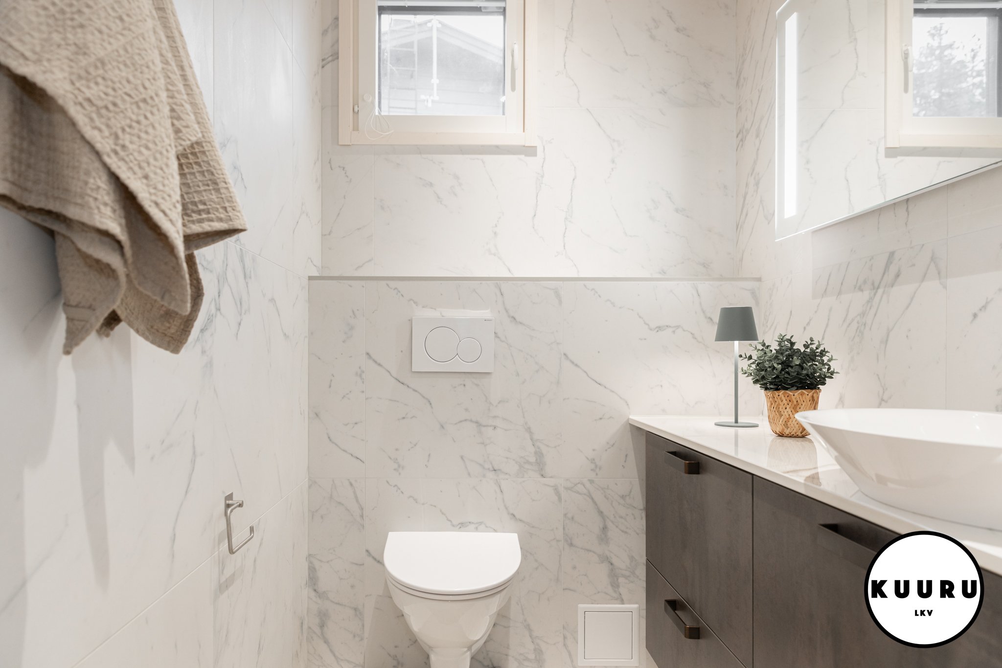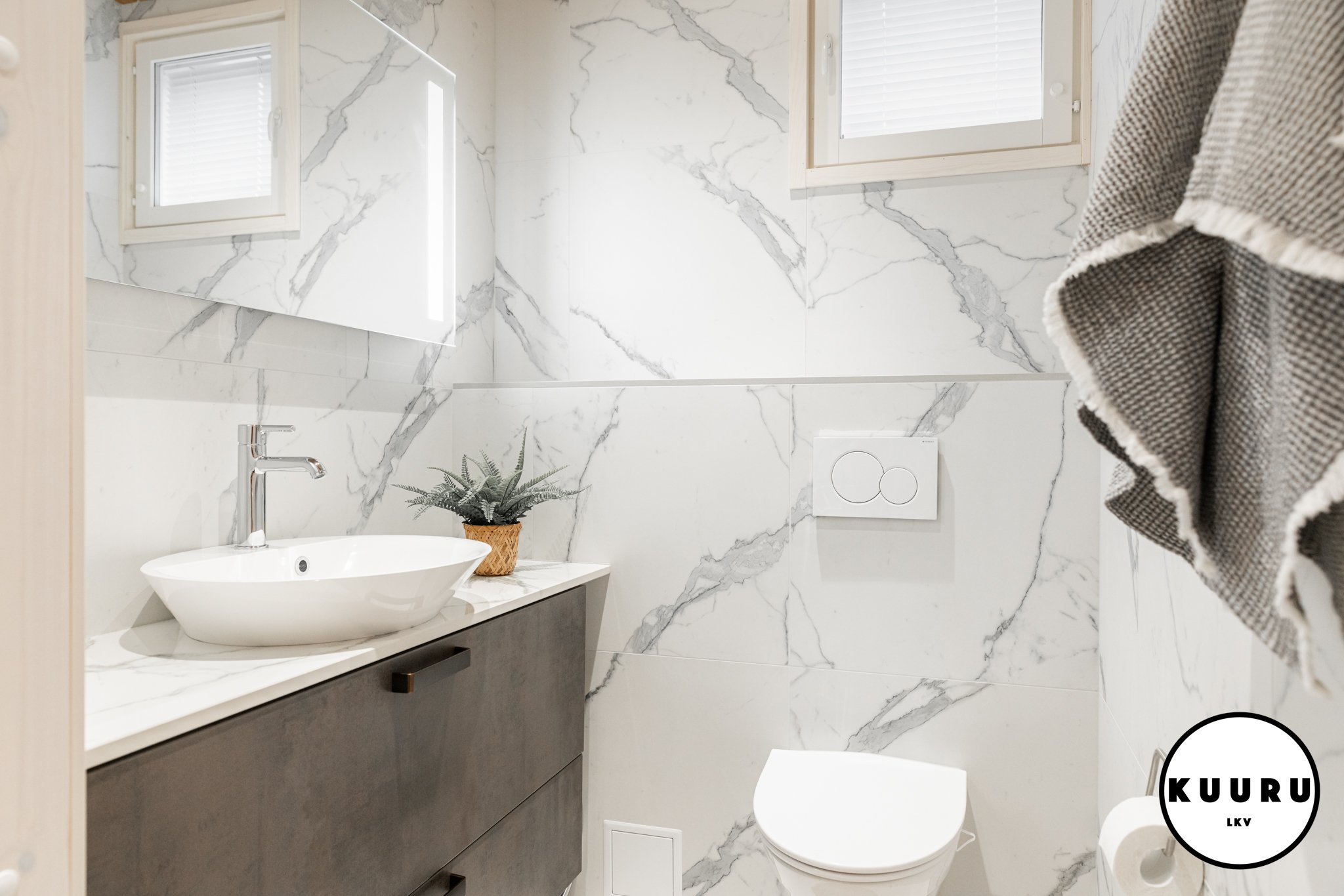 Valoisa ja raikas wc, jossa marmoria mukailevat pinnat ja lämminsävyinen puukatto luovat ylellisen hotellitunnelman. Pehmeä valaistus ja selkeälinjainen kalustus tekevät tilasta viimeistellyn ja helppohoitoisen. Arkea helpottaa, että tällaisia wc-tiloja on loma-asunnossa yhteensä kolme kappaletta: kaksi alakerrassa ja yksi yläkerrassa. Käytännöllistä mukavuutta isommallakin porukalla lomaillessa.