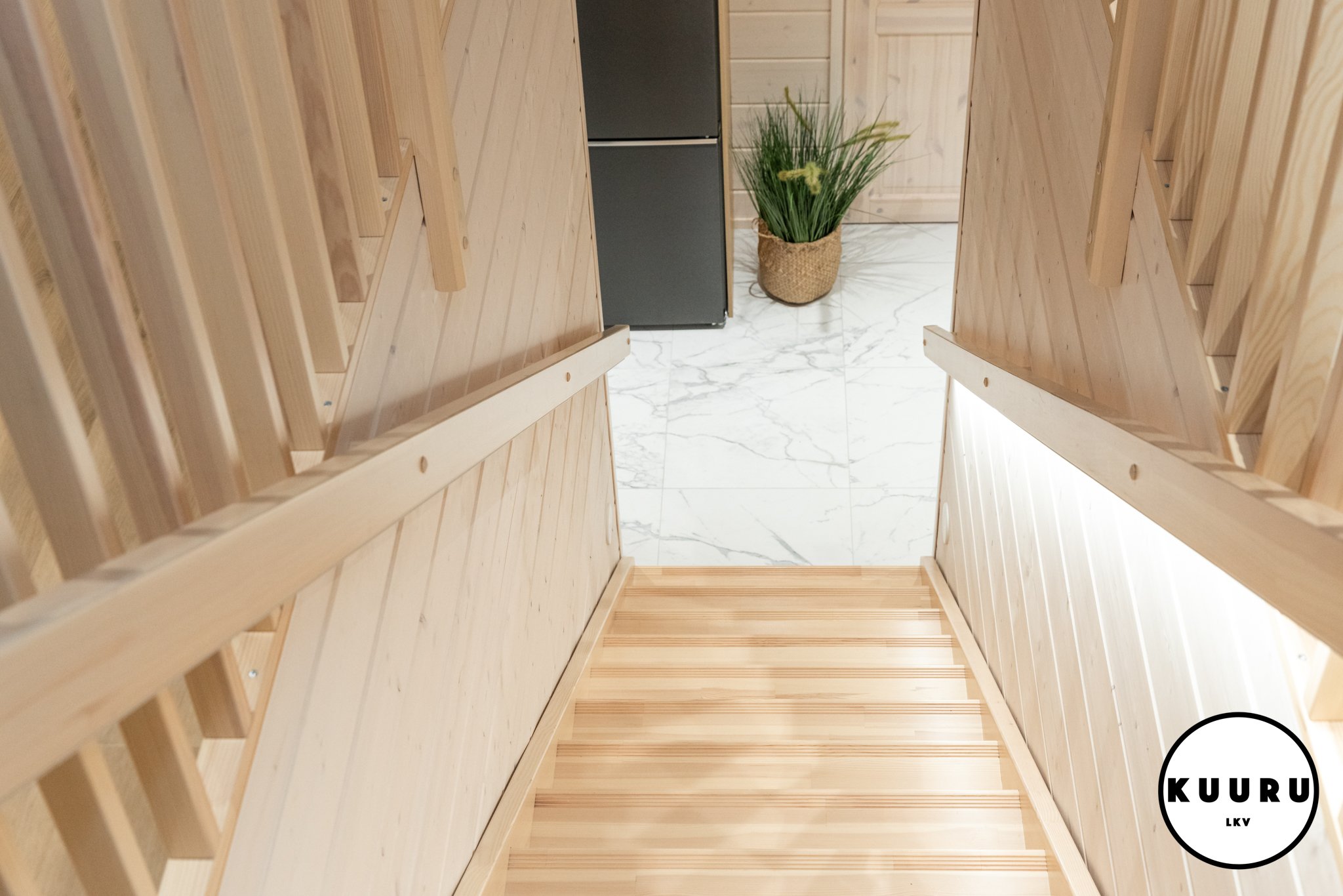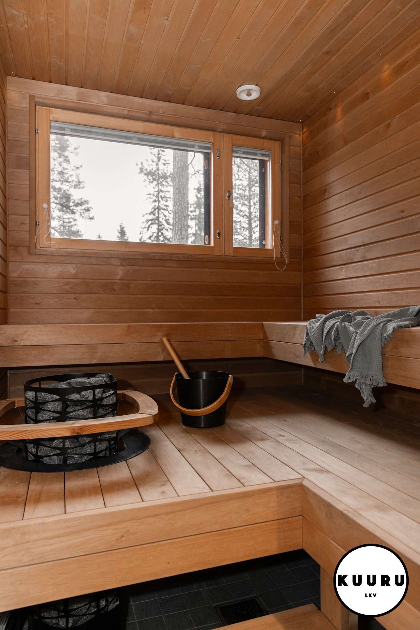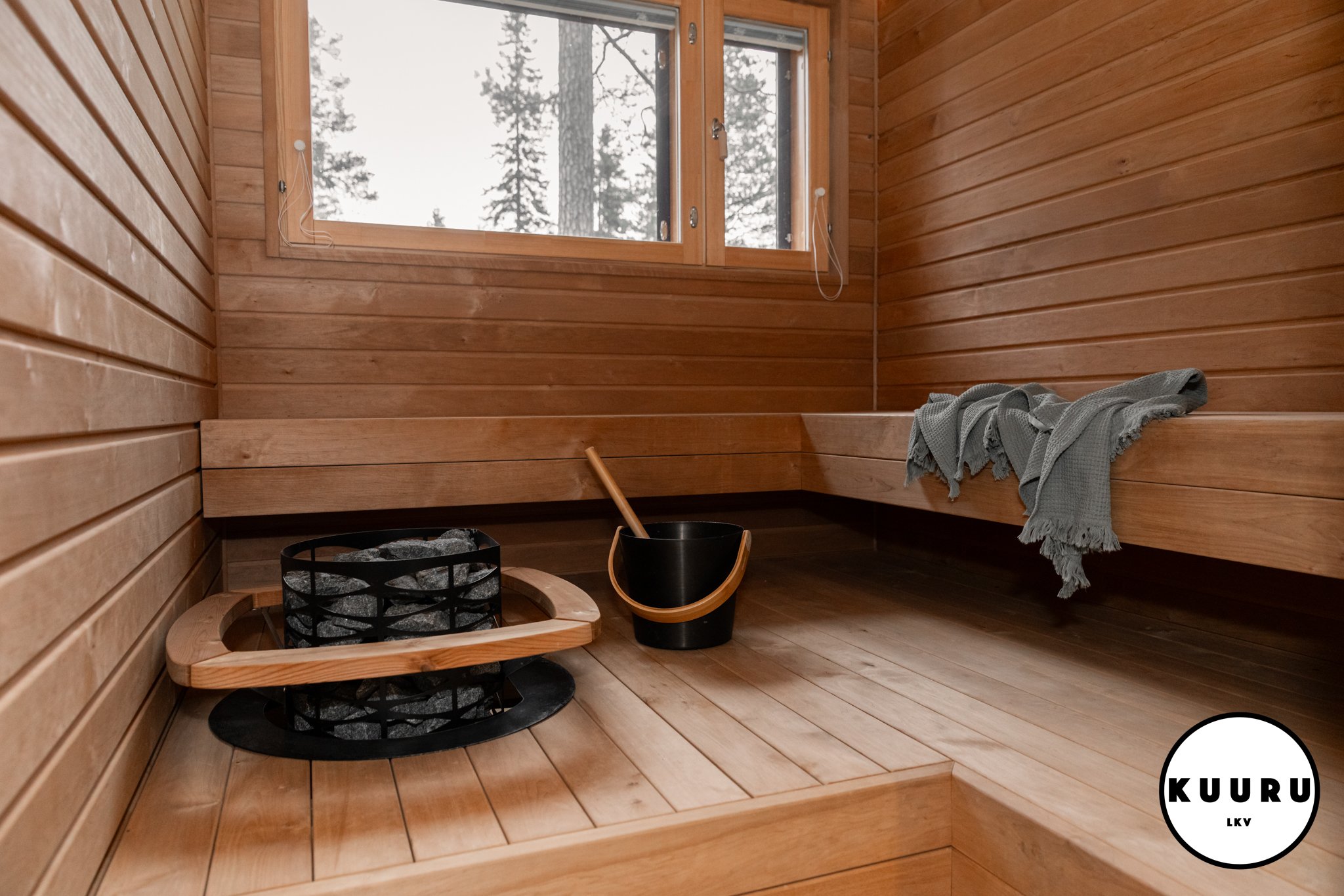 Uljas pylväskiuas antaa pehmeät ja pitkät löylyt, ja runsas kivimäärä varaa lämpöä tasaisesti. Ikkunasta avautuva metsäinen näkymä viimeistelee rauhoittavan hetken. Väljä lauderatkaisu tekee oleskelusta mukavaa – tänne on helppo istahtaa niin arjen pikasaunalle kuin viikonlopun hemmotteluhetkeen.