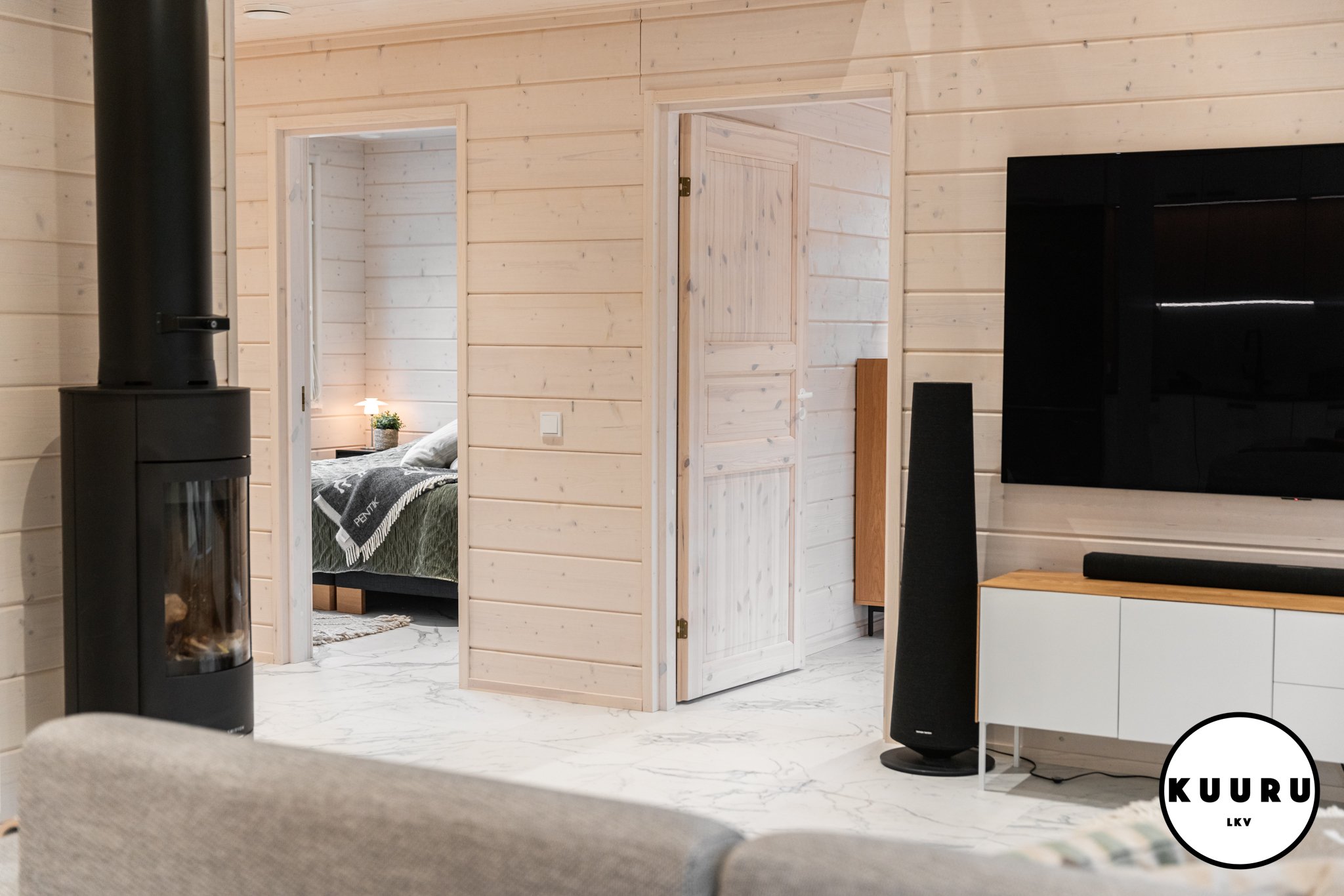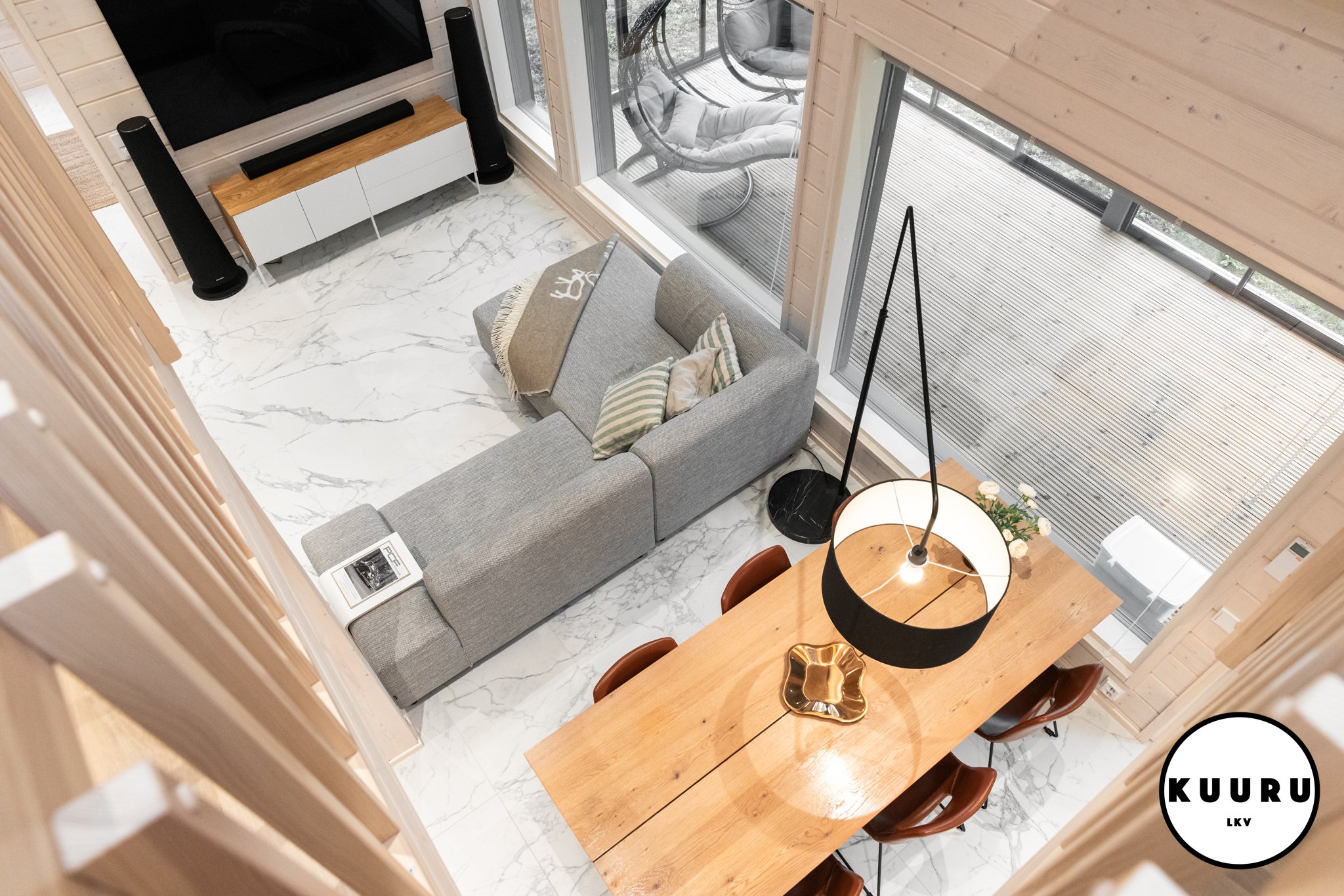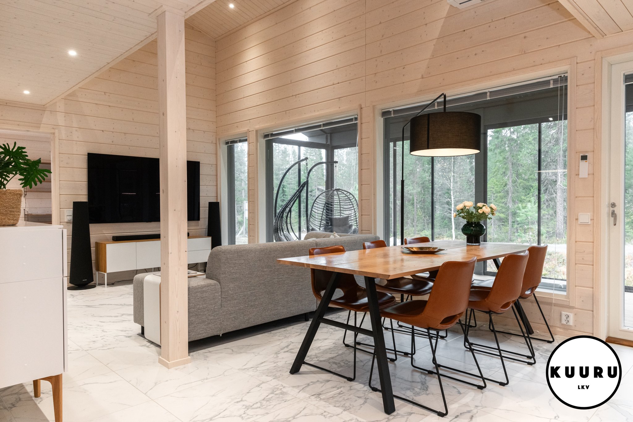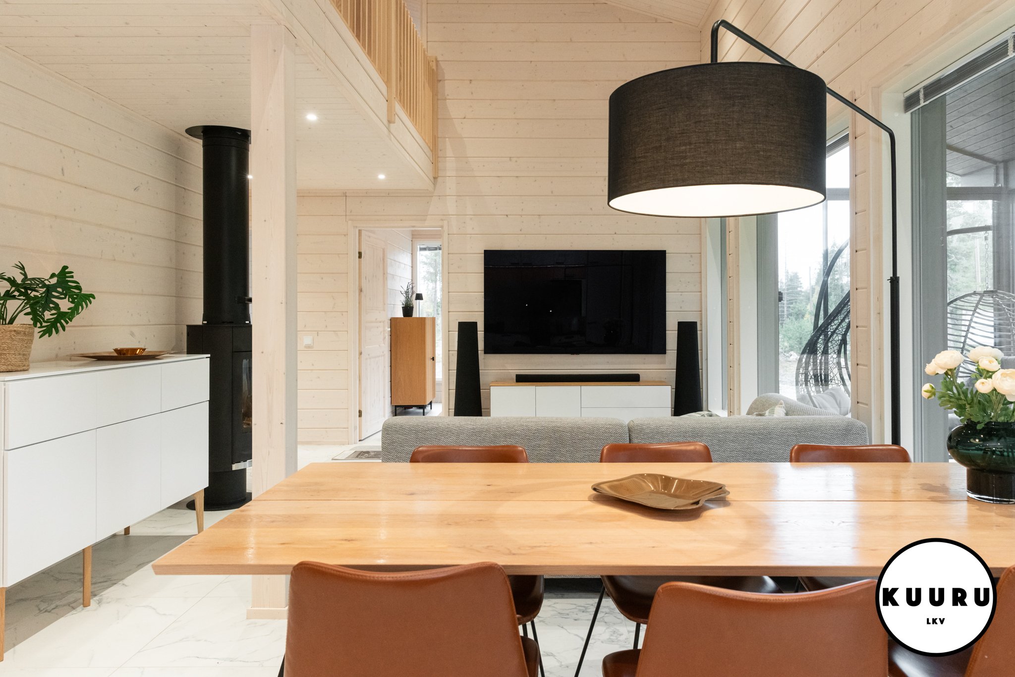 Jo sisään astuessa huomaa tilojen avaruuden ja valon määrän. Suuret ikkunat kehystävät kauniit tunturimaisemat ja tuovat luonnon osaksi sisustusta. Korkea huonekorkeus korostaa tilan arvokkuutta ja luo huvilaan ilmavan, levollisen tunnelman. Vaaleat sävyt ja marmoria muistuttava laattalattia tuovat kokonaisuuteen hienostuneen sävyn, jossa pohjoisen luonnon rauha ja moderni design kohtaavat sulavasti. Iso lasitettu parveke mahdollistaa ulkoilmasta ja aamukahveista nauttimisen säältä suojassa huonommallakin kelillä.