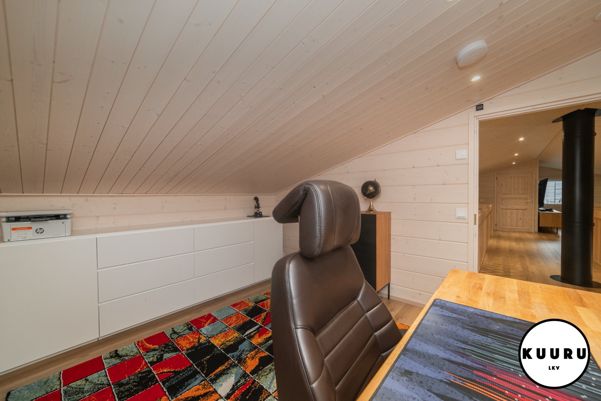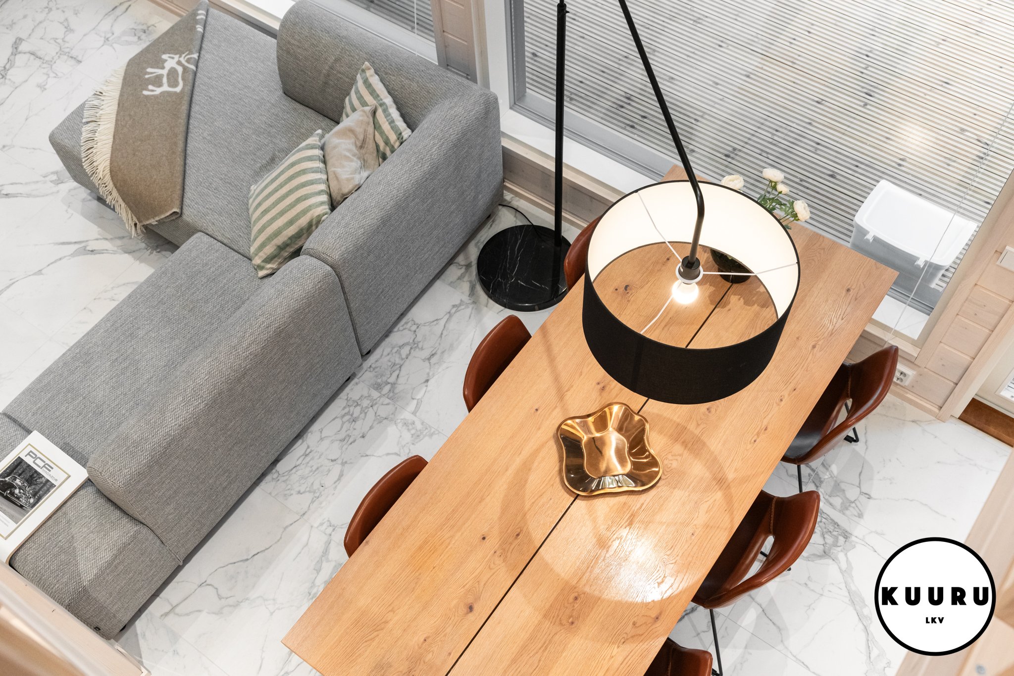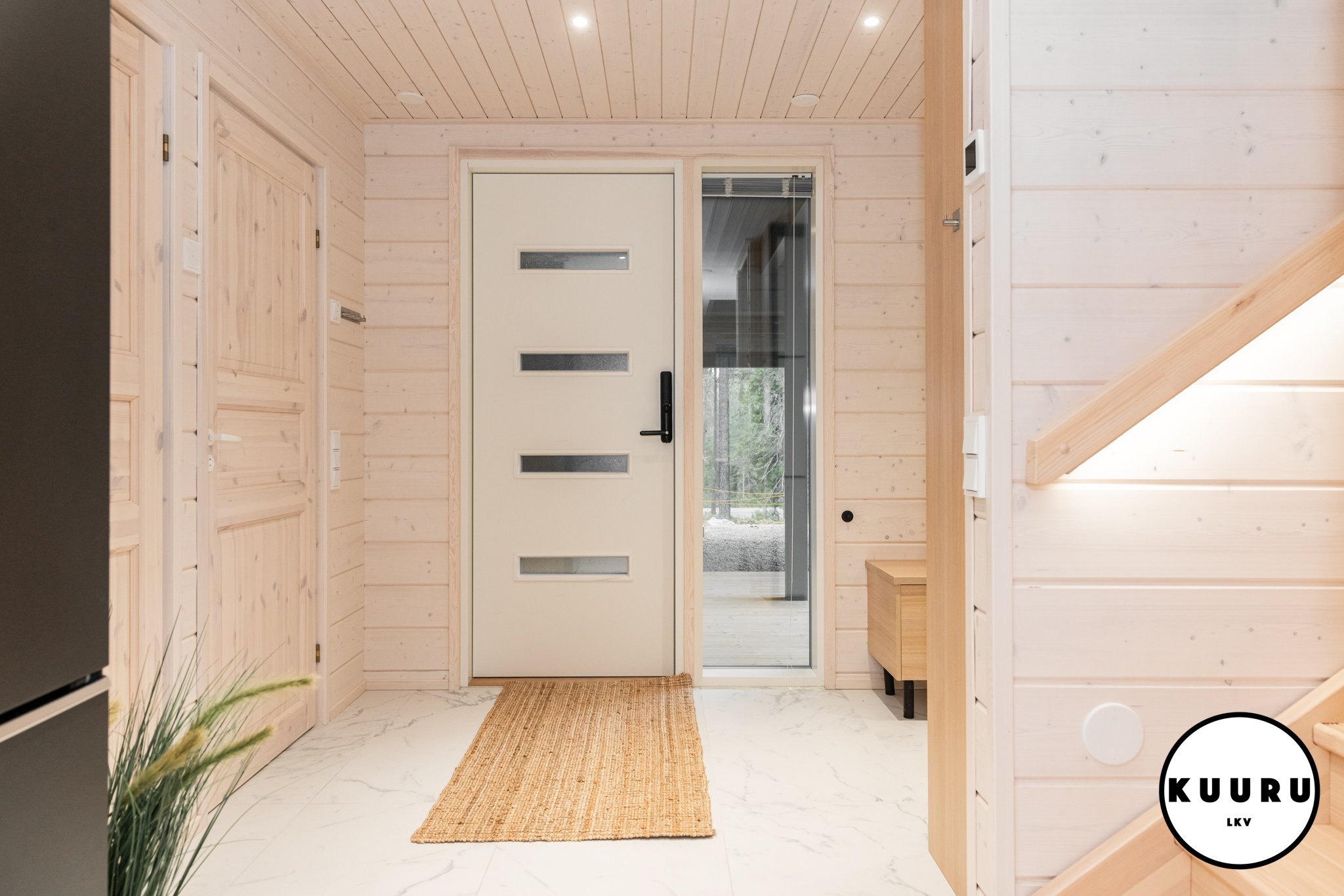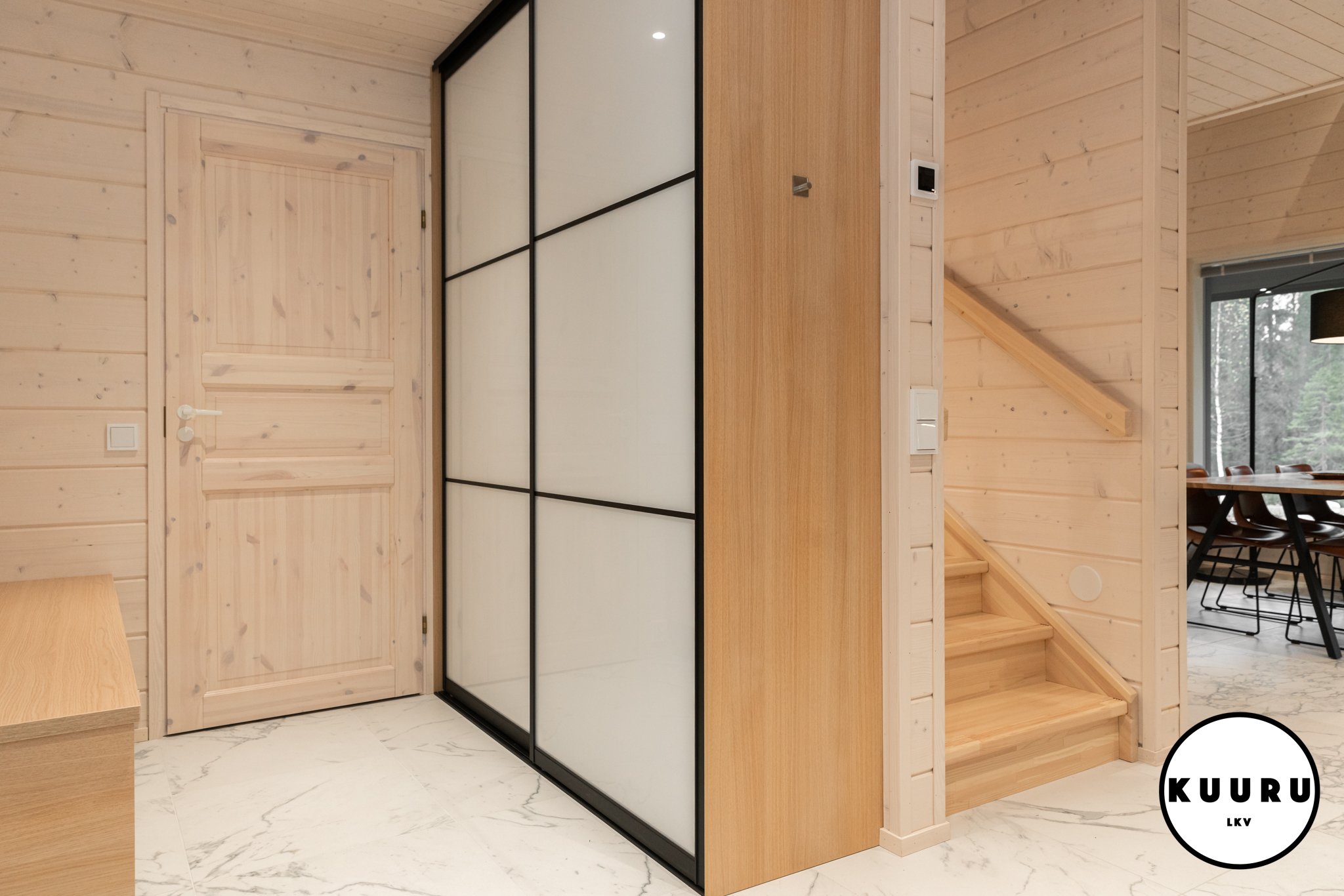 Jo sisään astuessa huomaa tilojen avaruuden ja valon määrän. Suuret ikkunat kehystävät kauniit tunturimaisemat ja tuovat luonnon osaksi sisustusta. Korkea huonekorkeus korostaa tilan arvokkuutta ja luo huvilaan ilmavan, levollisen tunnelman. Vaaleat sävyt ja marmoria muistuttava laattalattia tuovat kokonaisuuteen hienostuneen sävyn, jossa pohjoisen luonnon rauha ja moderni design kohtaavat sulavasti. Iso lasitettu parveke mahdollistaa ulkoilmasta ja aamukahveista nauttimisen säältä suojassa huonommallakin kelillä.