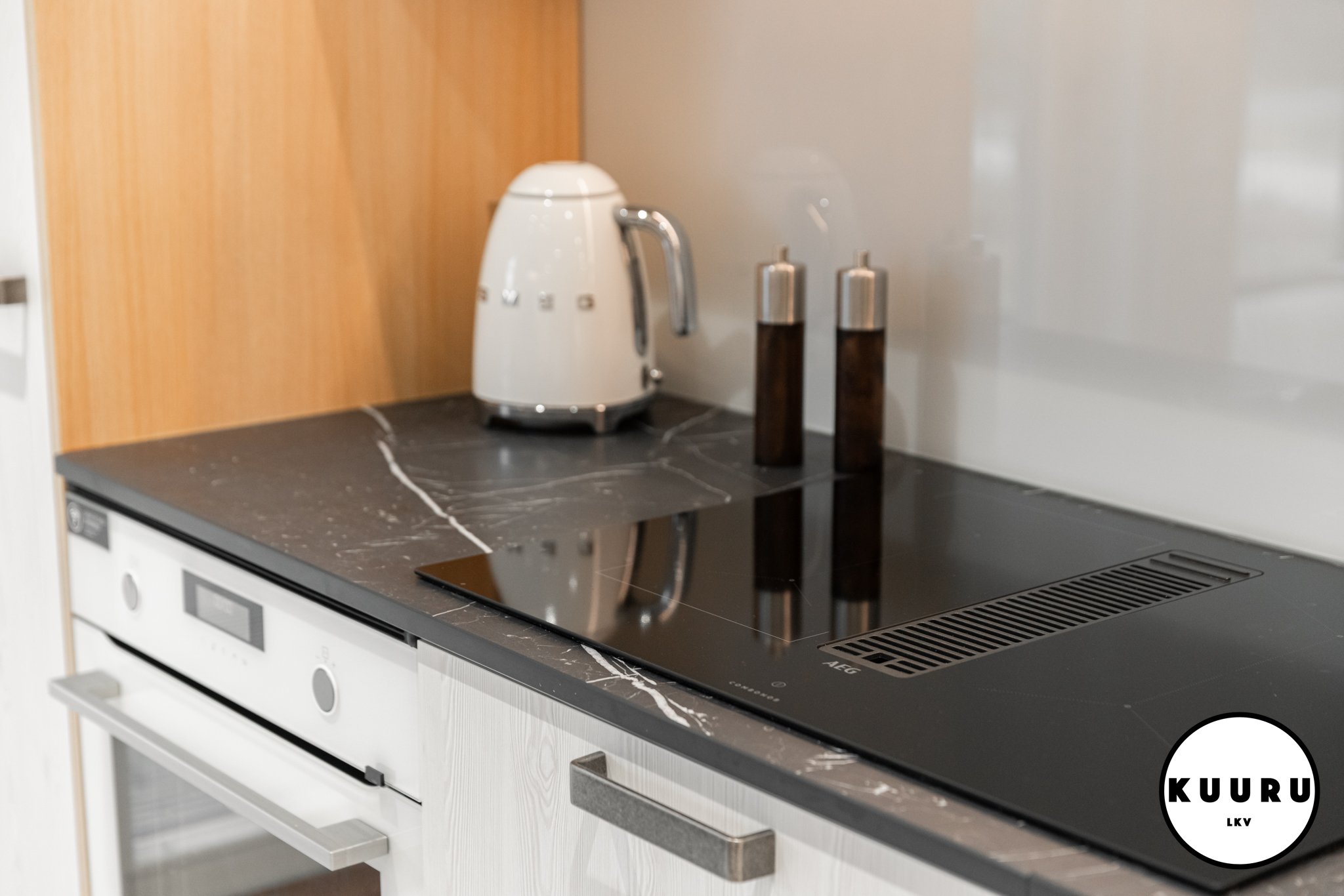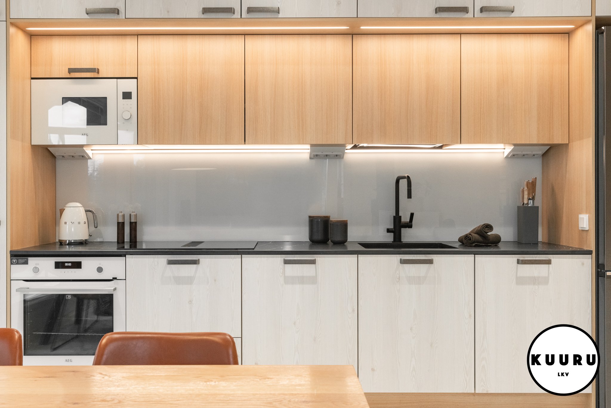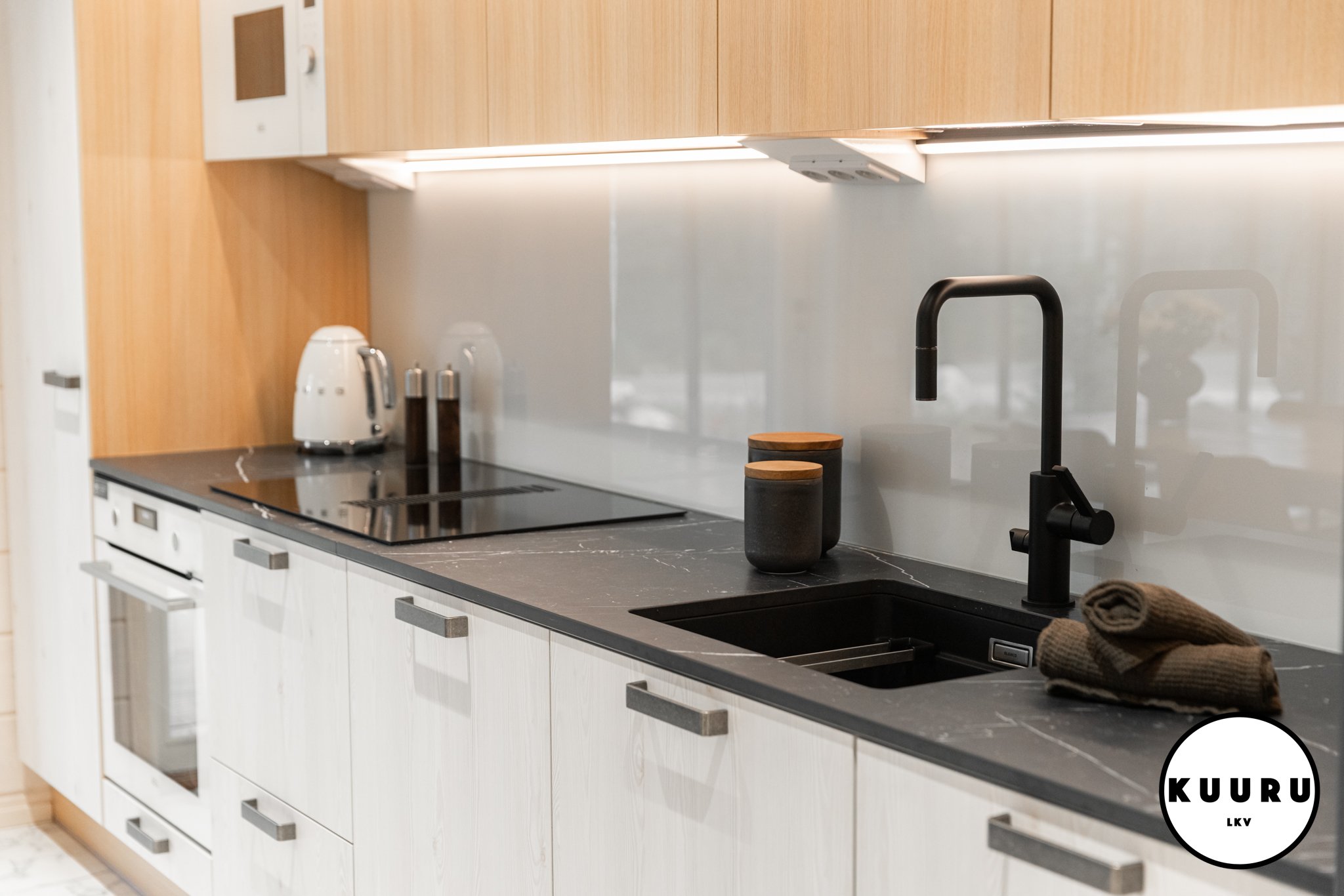 Tyylikäs ja rauhallinen Puustellin keittiö toimii kodin sydämenä: vaalea puu ja tummat yksityiskohdat luovat hienostuneen ilmeen. Pehmeä kaapistovalaistus ja viimeistellyt pinnat tuovat ripauksen ylellisyyttä arkeen. Pitkä työskentelytaso ja runsaat kaapistot tarjoavat reilusti työskentelytilaa ja säilytystilaa ilman ahtauden tunnetta. Marmoria muistuttava lattia viimeistelee kokonaisuuden.
