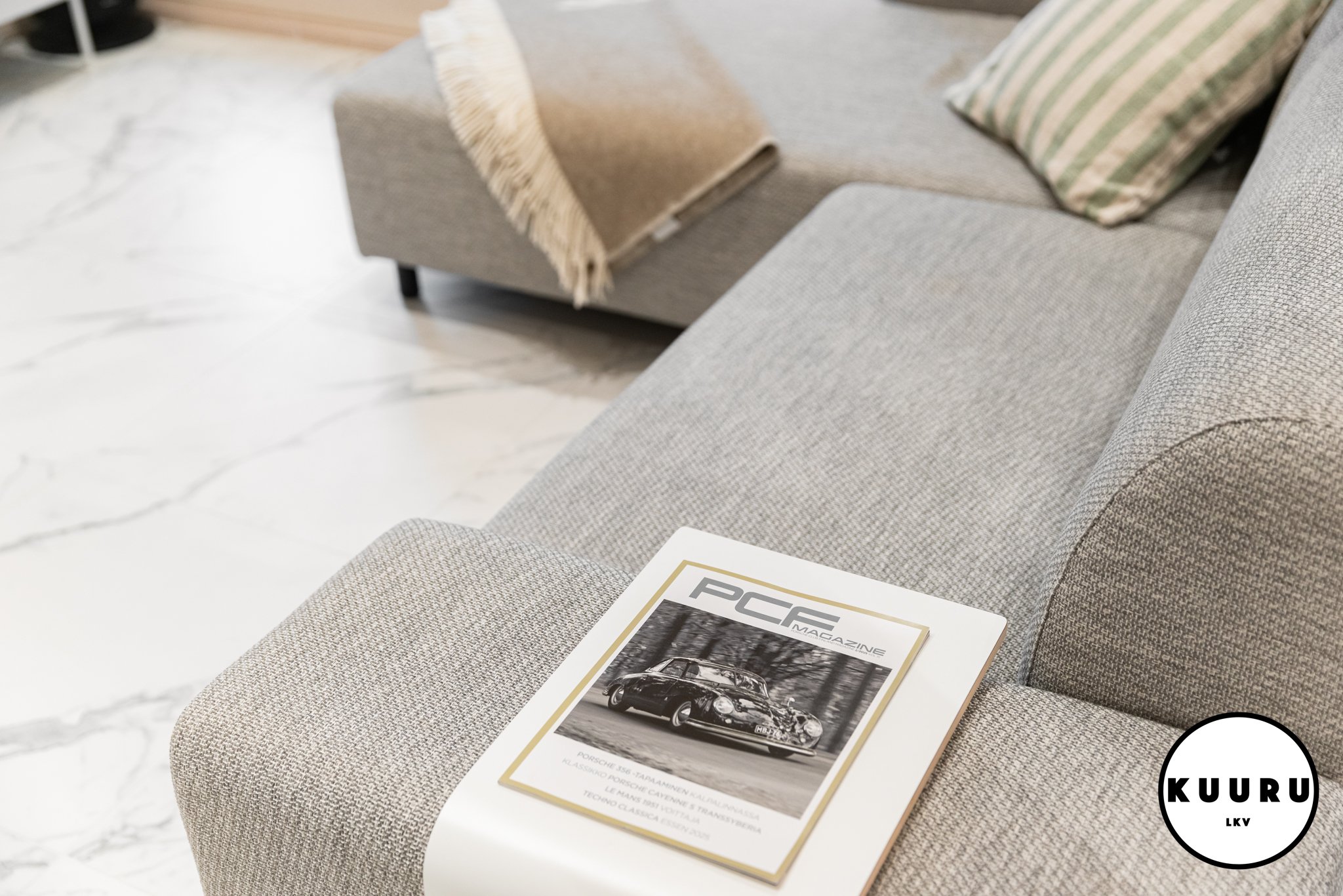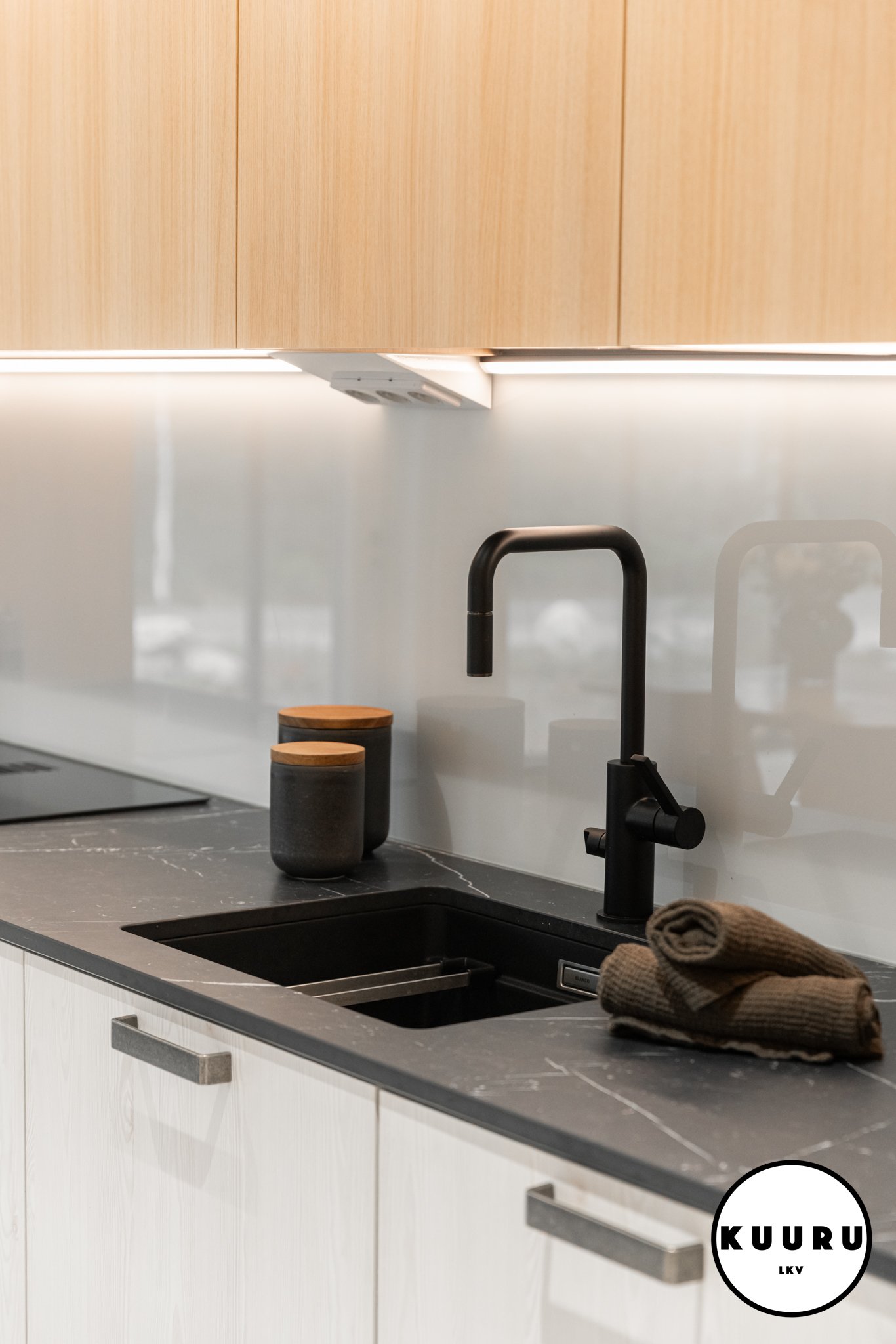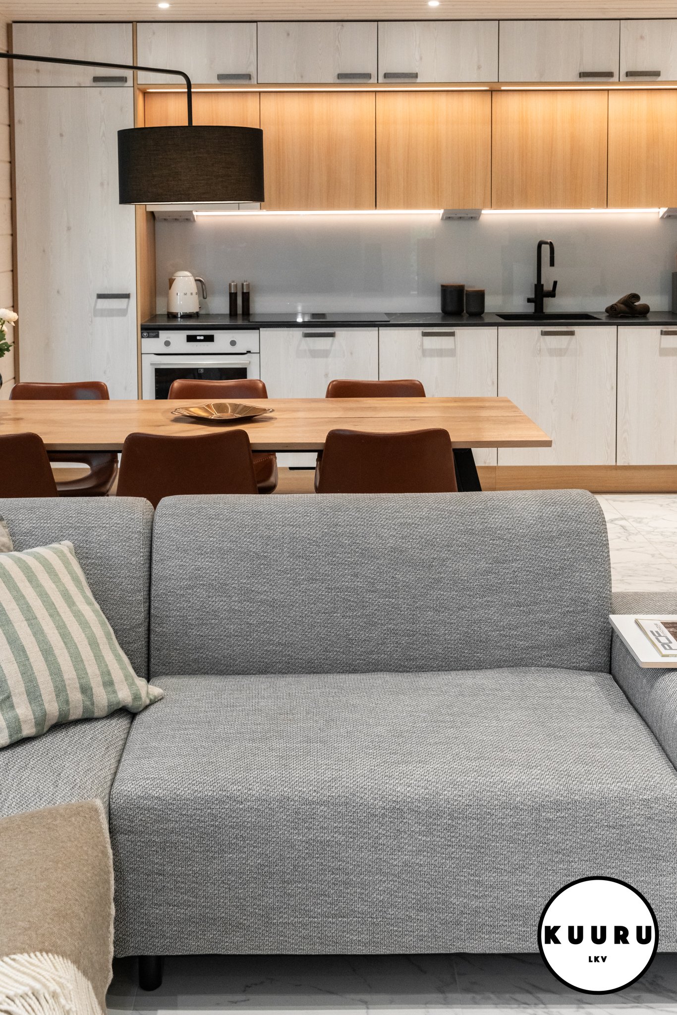 Tyylikäs ja rauhallinen Puustellin keittiö toimii kodin sydämenä: vaalea puu ja tummat yksityiskohdat luovat hienostuneen ilmeen. Pehmeä kaapistovalaistus ja viimeistellyt pinnat tuovat ripauksen ylellisyyttä arkeen. Pitkä työskentelytaso ja runsaat kaapistot tarjoavat reilusti työskentelytilaa ja säilytystilaa ilman ahtauden tunnetta. Marmoria muistuttava lattia viimeistelee kokonaisuuden.