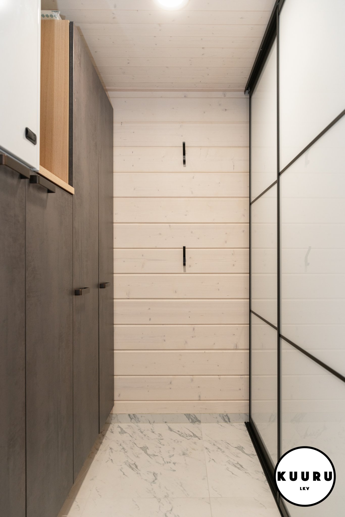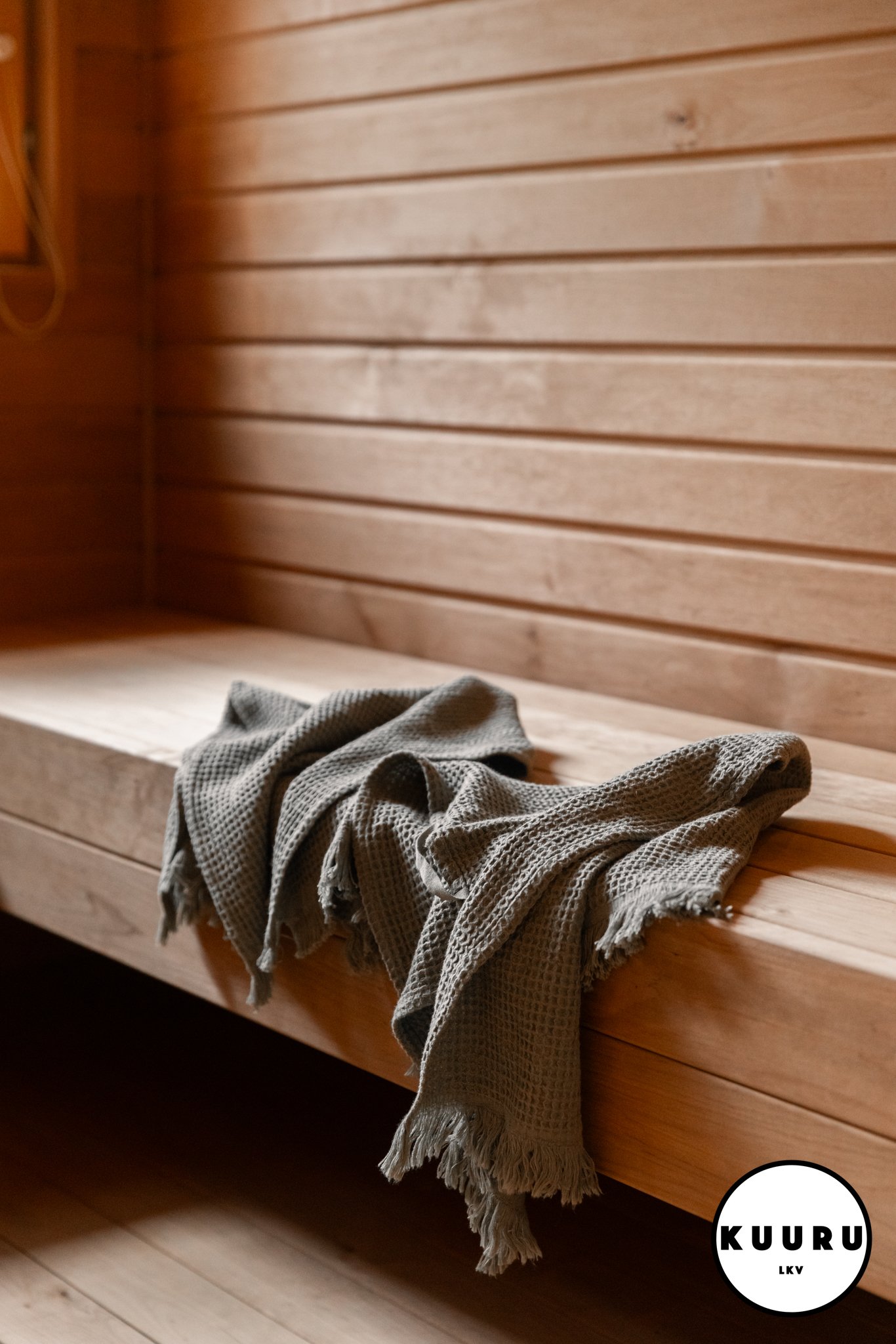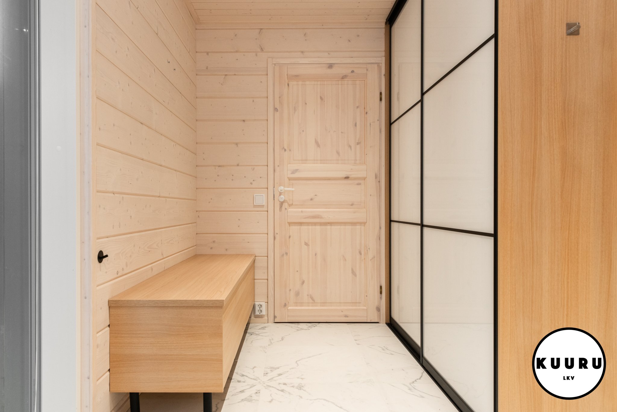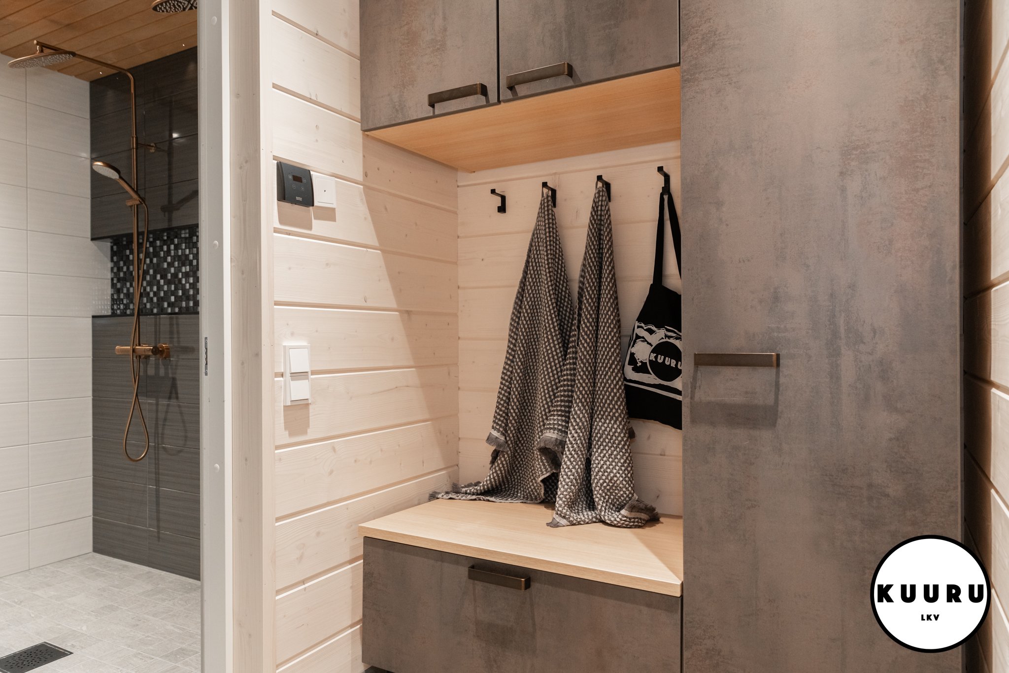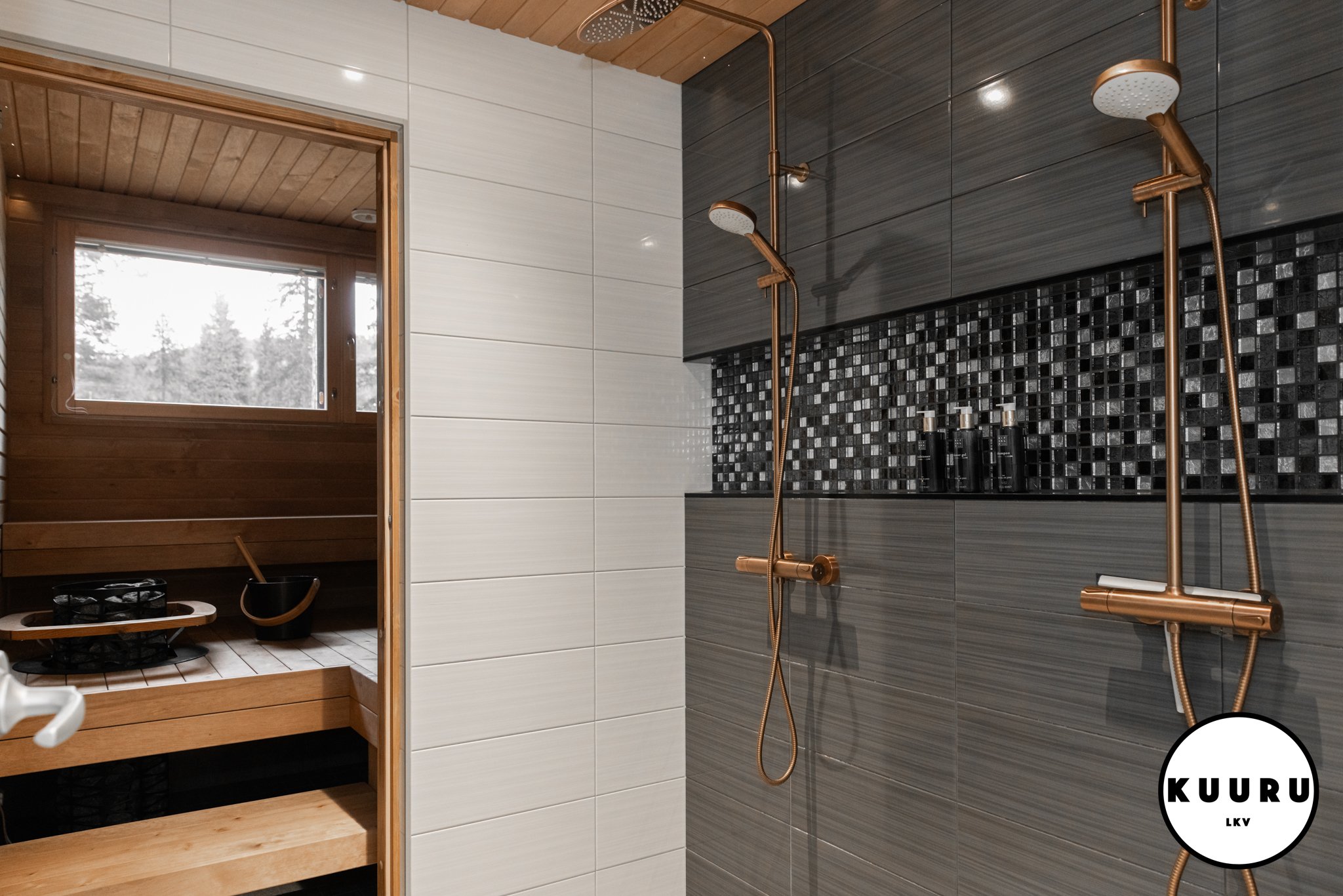 Lasioven takana sauna odottaa pehmeine löylyineen, ja ikkunasta siivilöityvä luonnonvalo viimeistelee ylellisen hetken.
