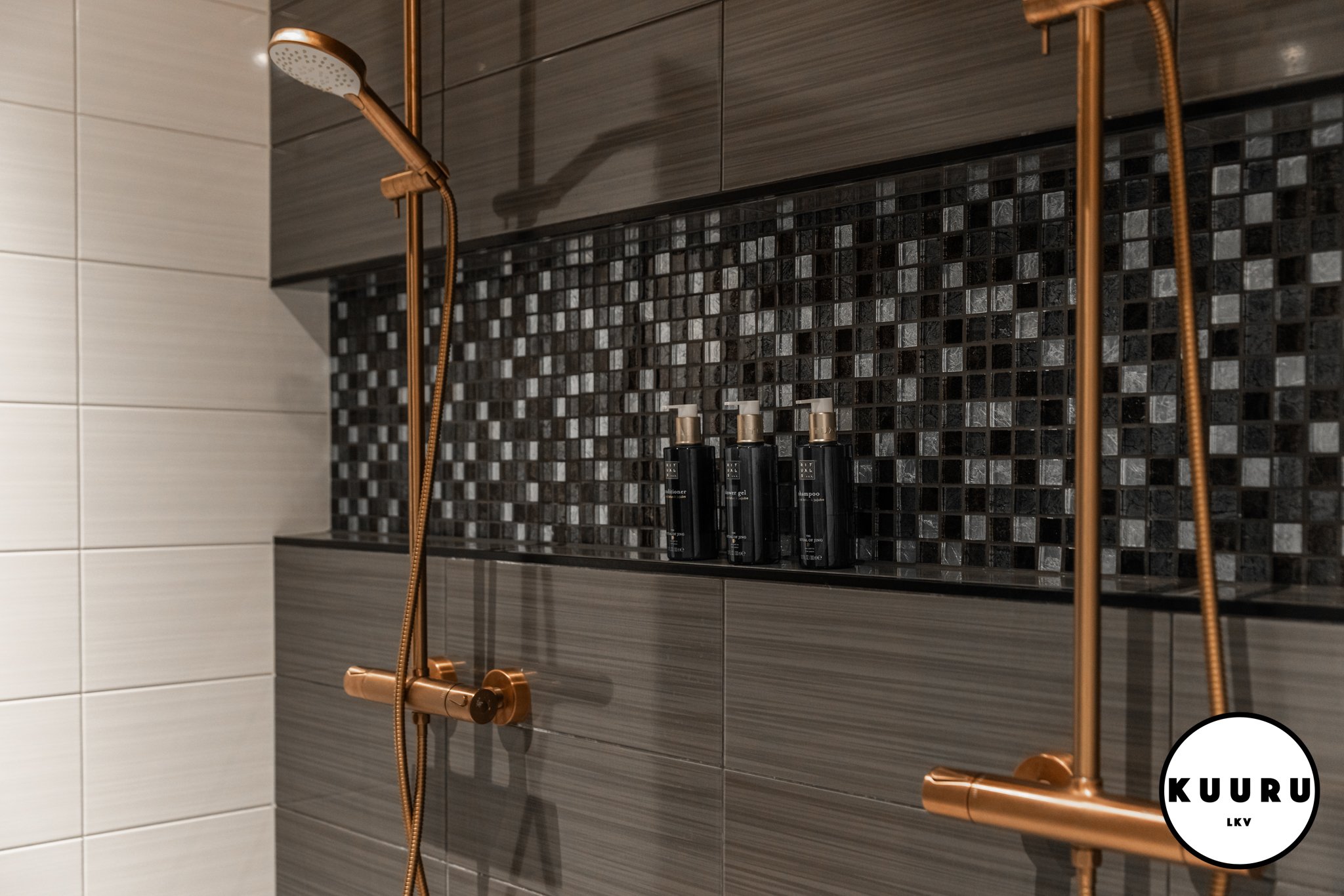 Kaksi sadesuihkua kutsuu pitkään ja virkistävään pesuhetkeen – kiireettömät aamut ja iltojen saunahetket sujuvat omassa tahdissa. Seinän hyllysyvennys pitää suosikkituotteet kauniisti esillä ja tilan aina huoliteltuna.