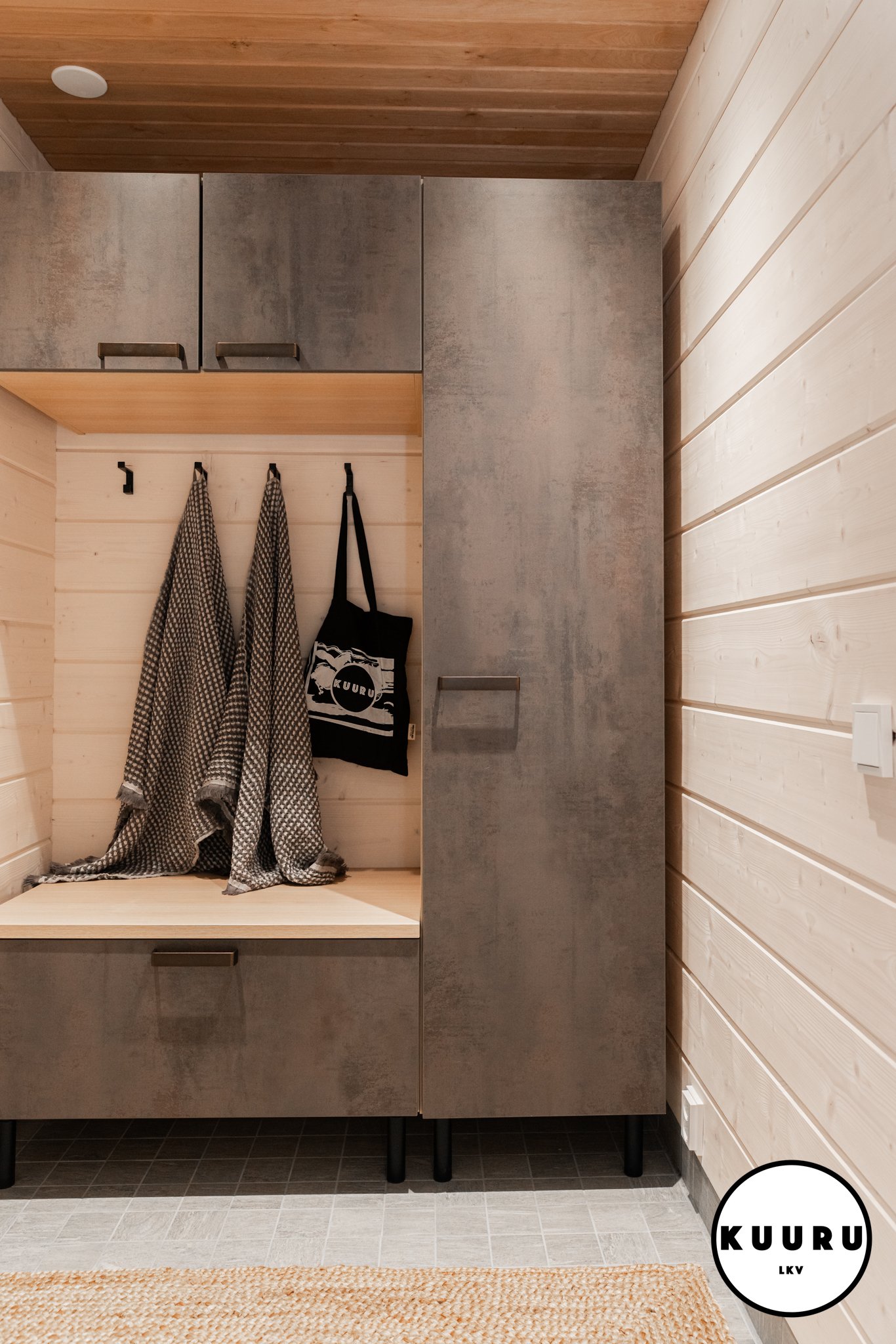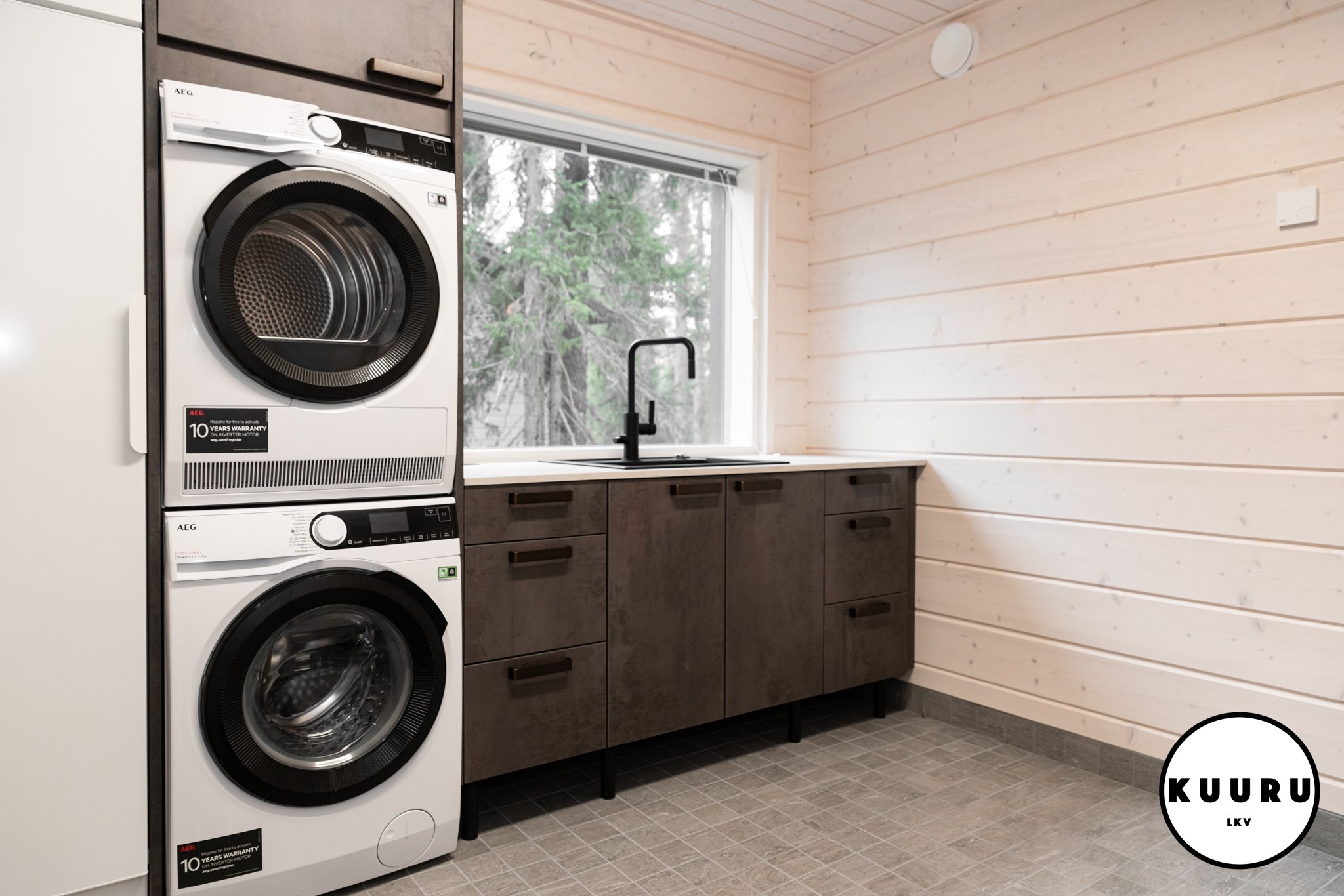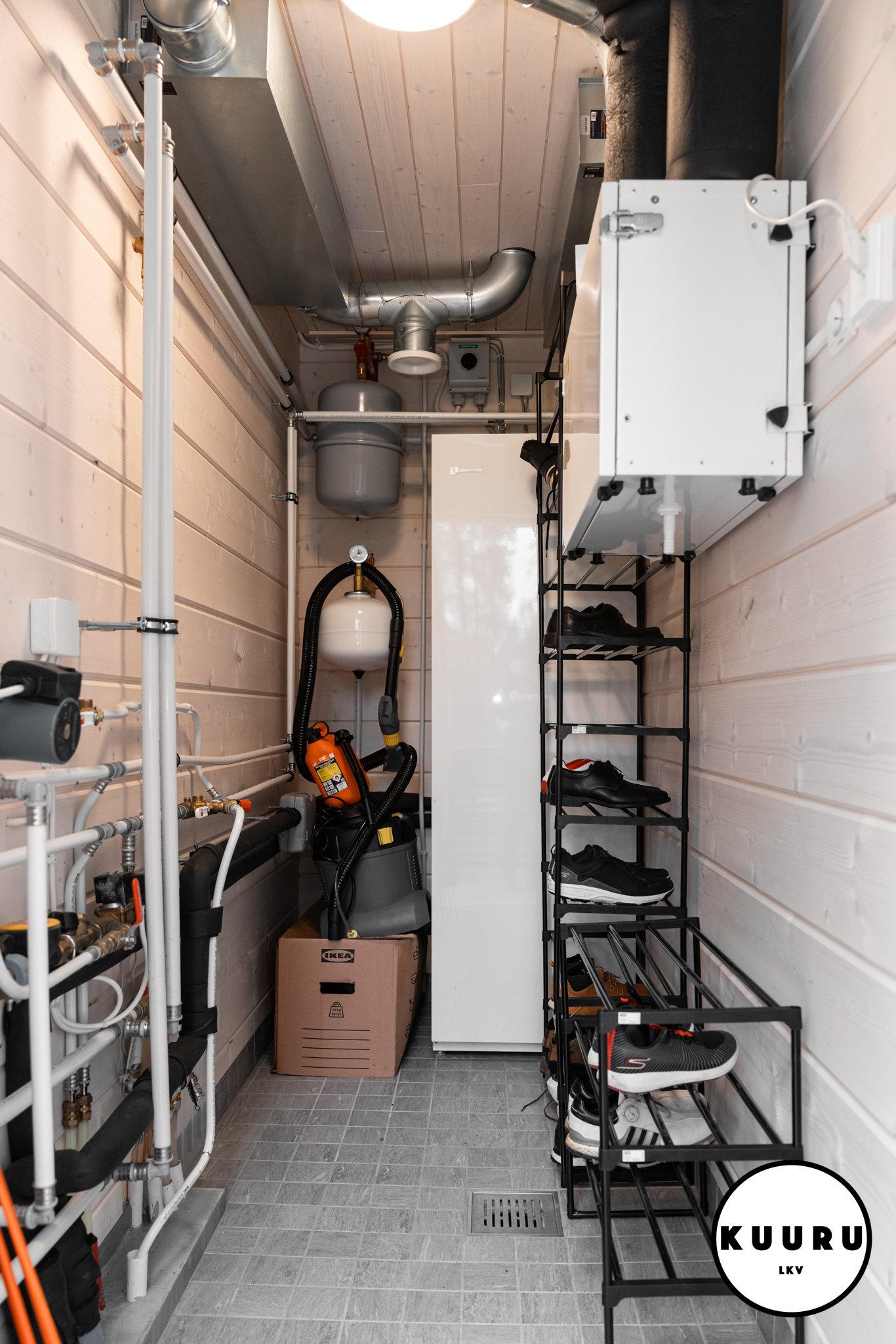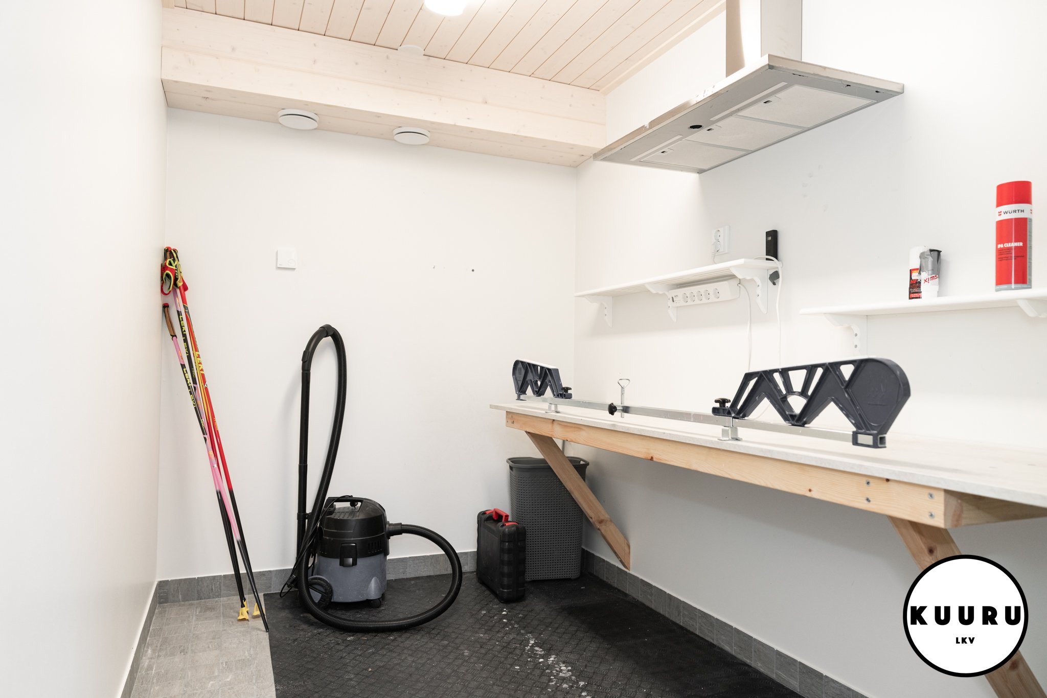 Kodinhoito huone sijaitsee piharakennuksessa helpottaen lomailua, kun aktiviteeteista voi tulla suoraan kodinhoitohuoneeseen ja kuivumaan jätetyt ulkoiluvetimet eivät häiritse huvilan ylellistä tunnelmaa.