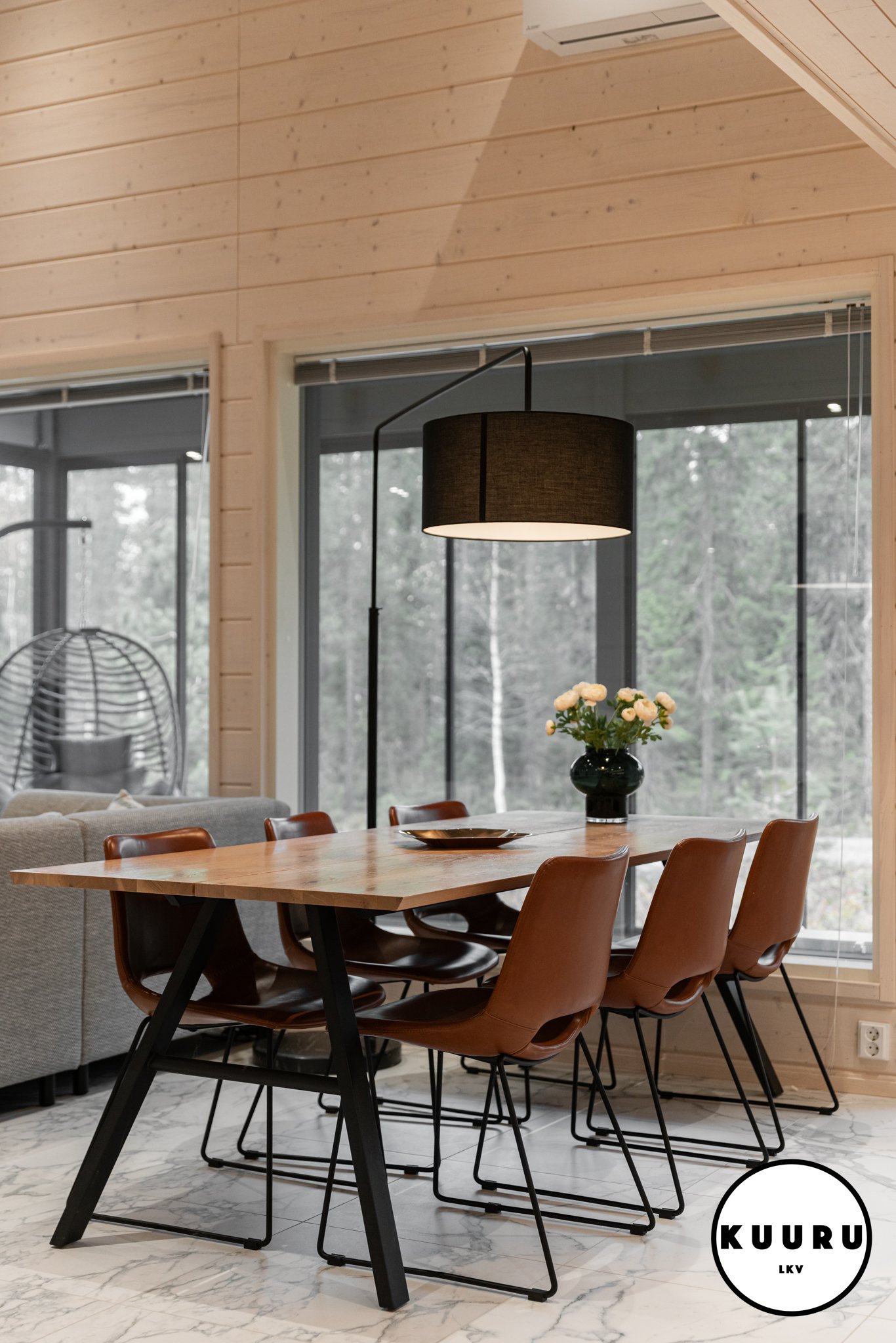 Olohuone kylpee valossa suurten ikkunoiden ja vaikuttavan huonekorkeuden ansiosta. Vaaleat sävyt ja marmoria mukaileva laattalattia henkivät hienovaraista ylellisyyttä. Kalusteille on reilusti tilaa ja kulku säilyy selkeänä – metsään avautuvat näkymät viimeistelevät levollisen tunnelman. Näissä tiloissa on helppo viihtyä ja nauttia lomailusta niin perheen kuin ystävienkin kesken. Lisää oleskelutilaa löytyy yläkerran aulasta, jossa on mukavasti tilaa esimerkiksi nuoremmille lomailijoille.