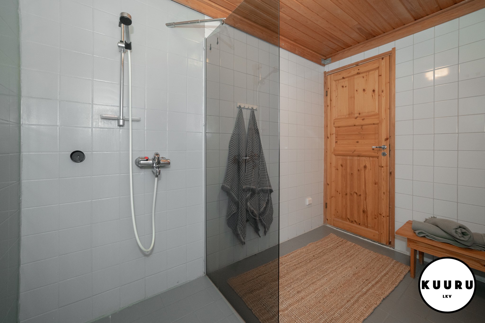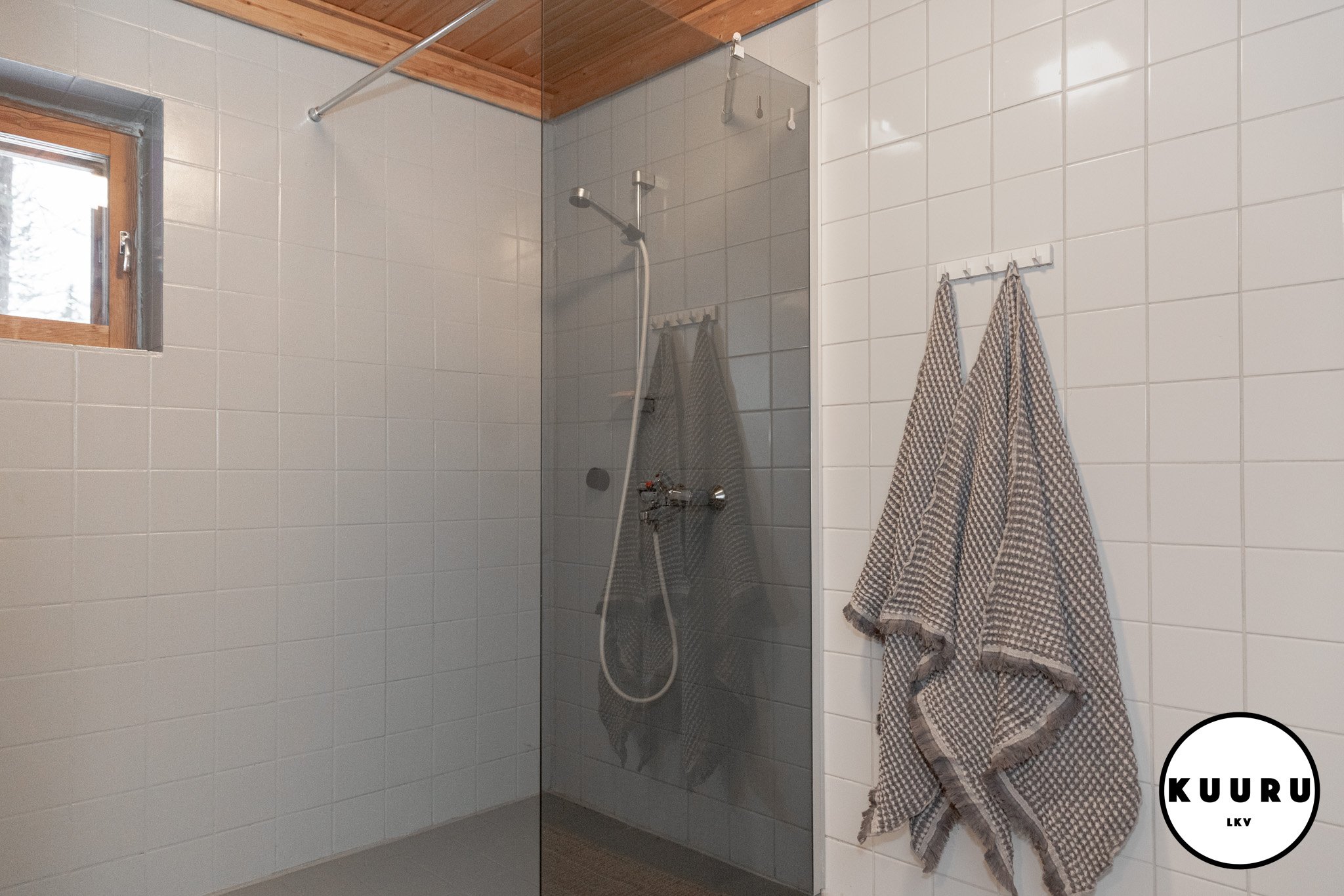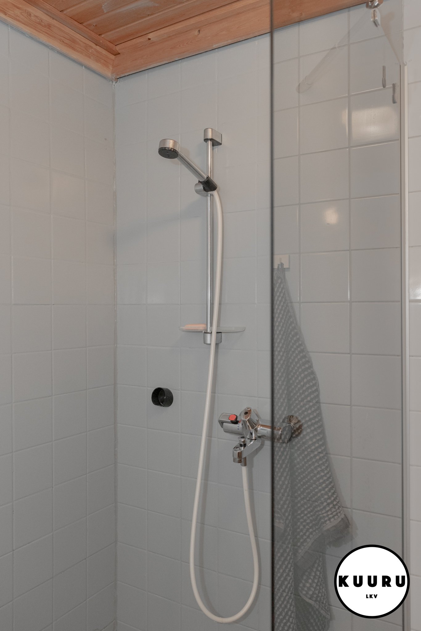 Suihku, suihkuseinä, lattialämmitys, pesukone ja pesukoneliitäntä