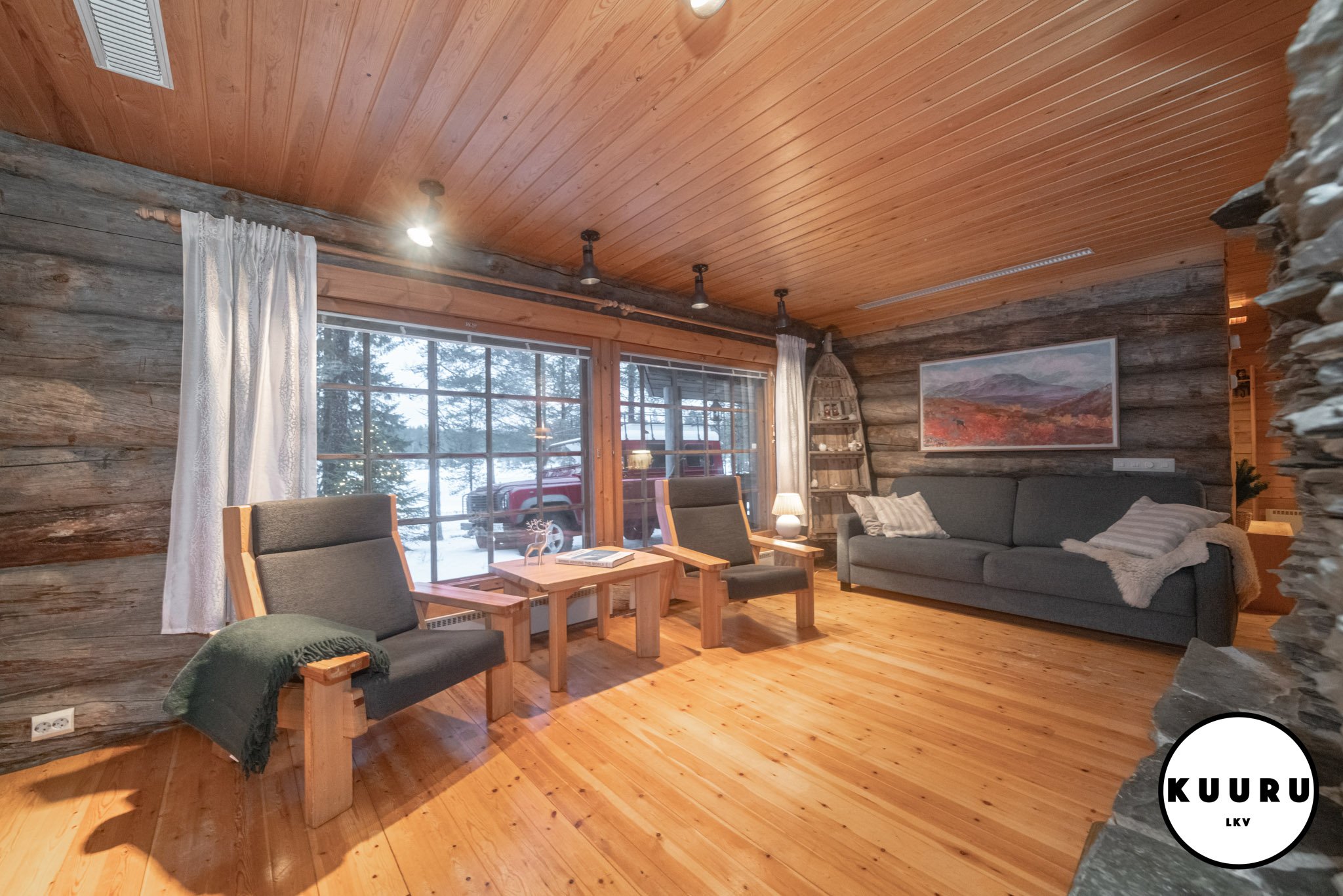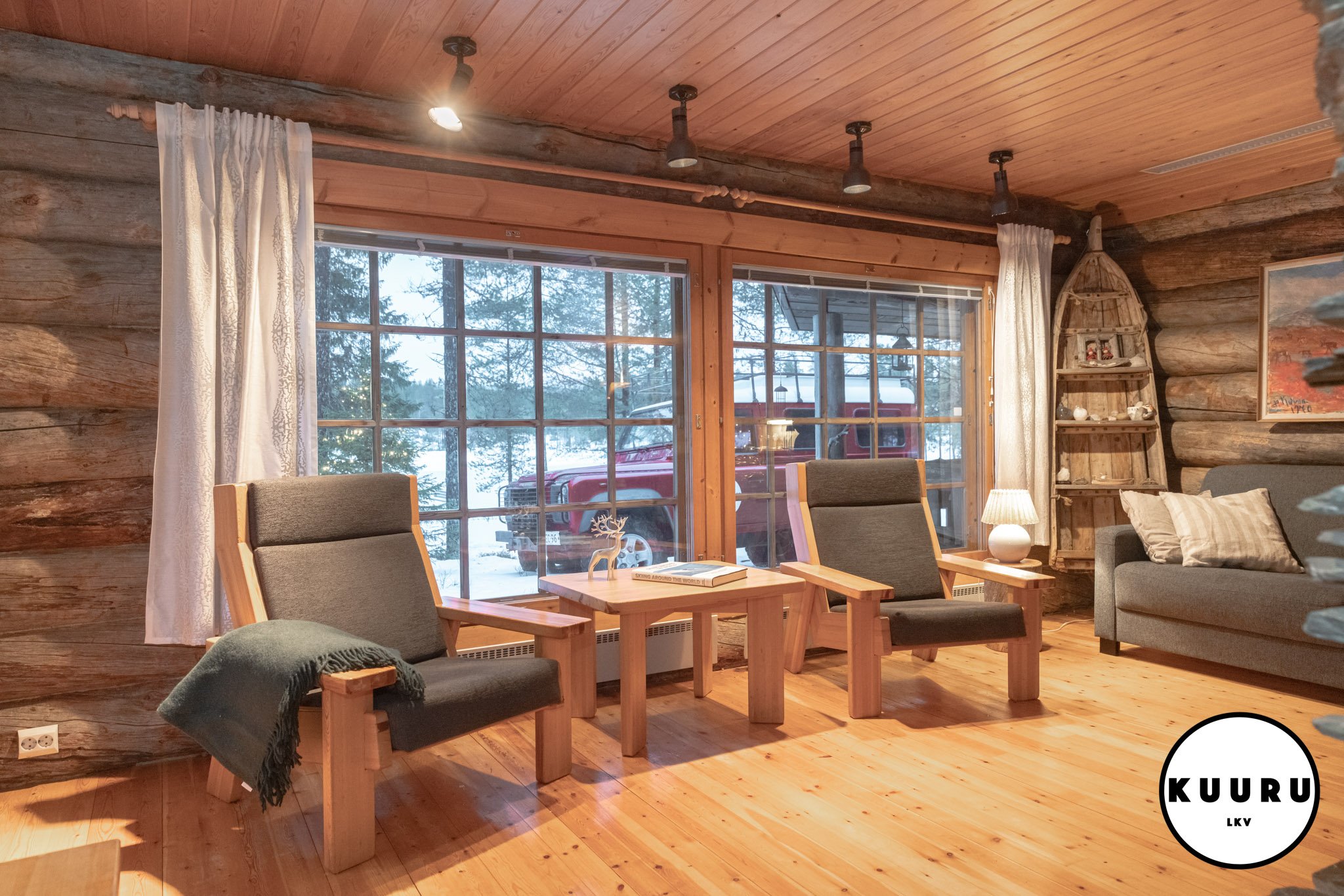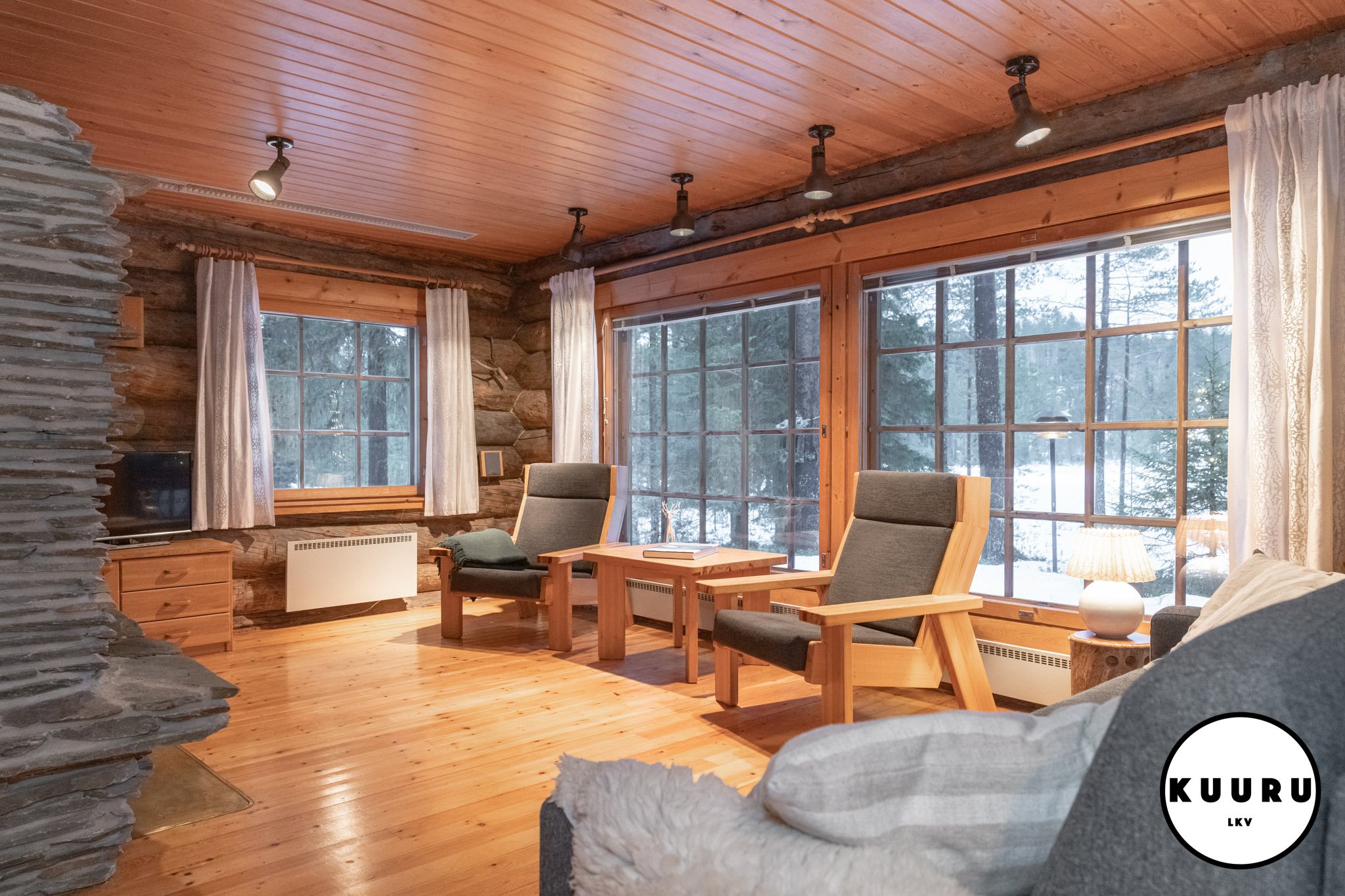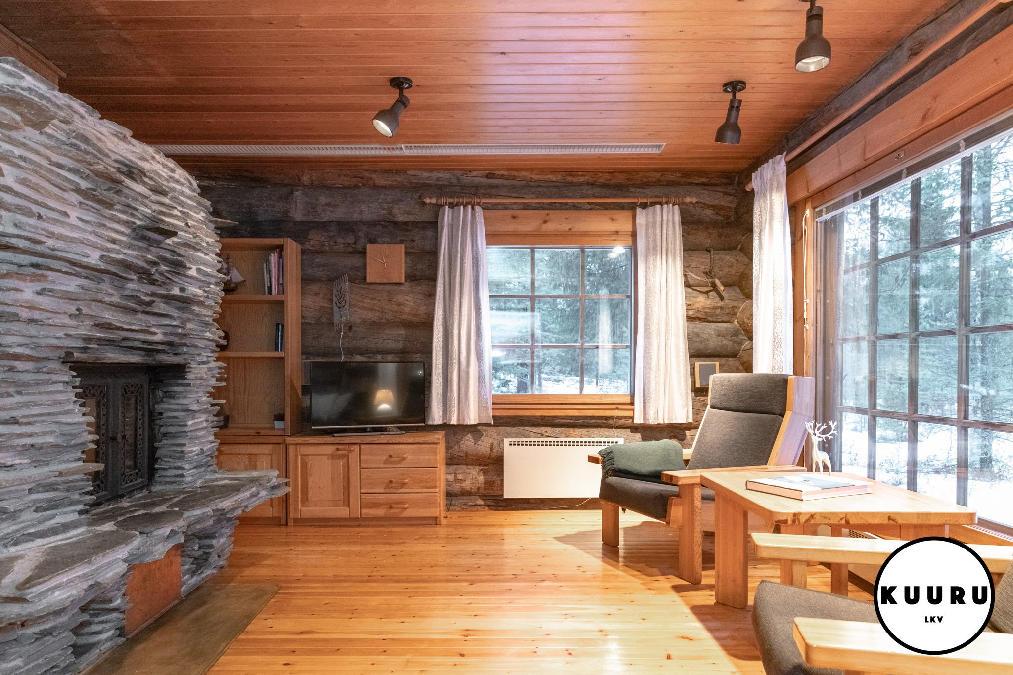 Kohteessa on avara olohuone, jossa on runsaasti ikkunoita, joista aukeaa upea maisema lammelle sekä pohjoissuomalaiseen kuusimetsään. Ikkunoiden määrä tuo valoa huoneeseen, joka tasapainottaa tummaa keloseinäistä materiaalia. Tänne on mukava kokoontua viettämään iltoja luonnonkivitakan ääreen iltojen hämärtyessä.
