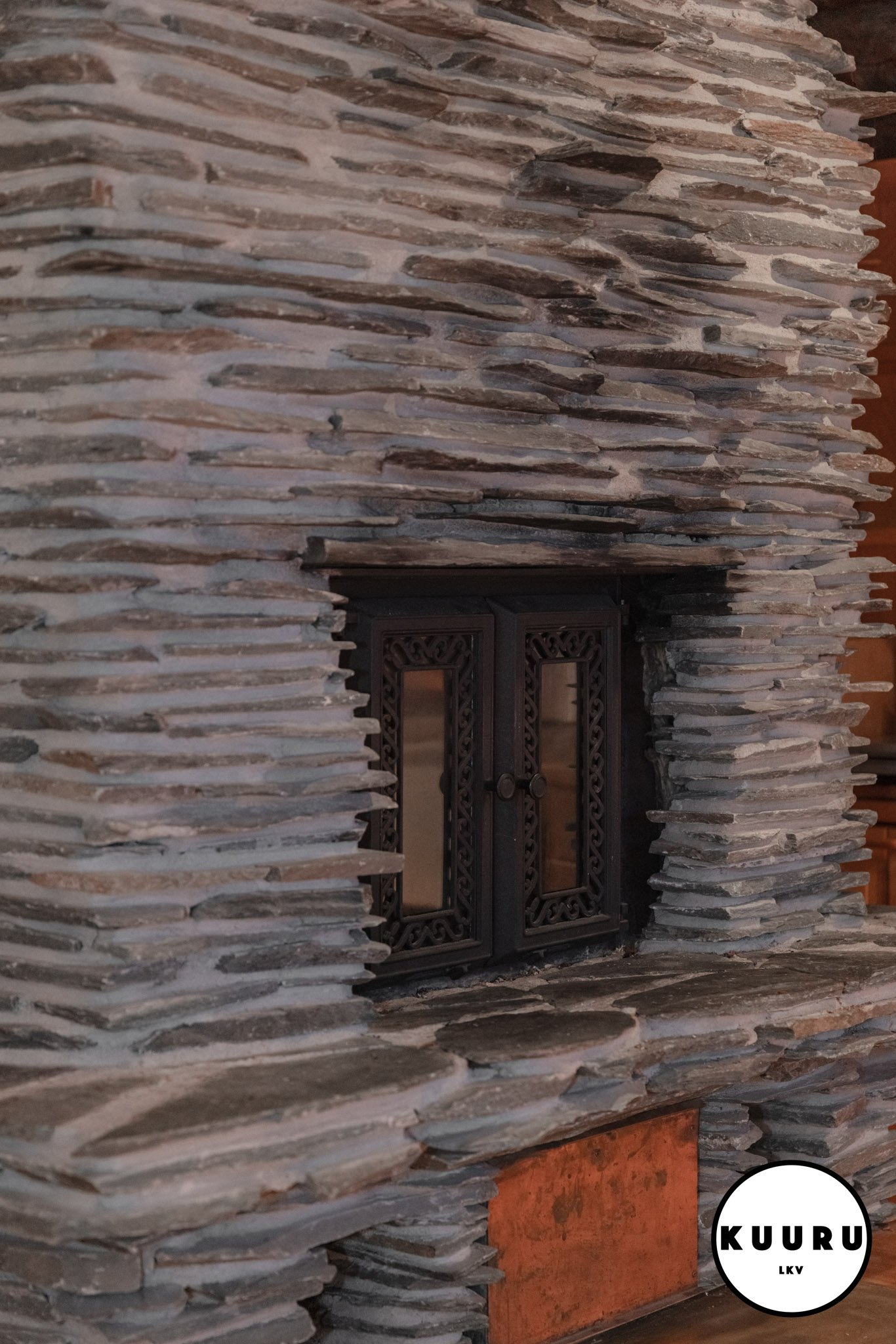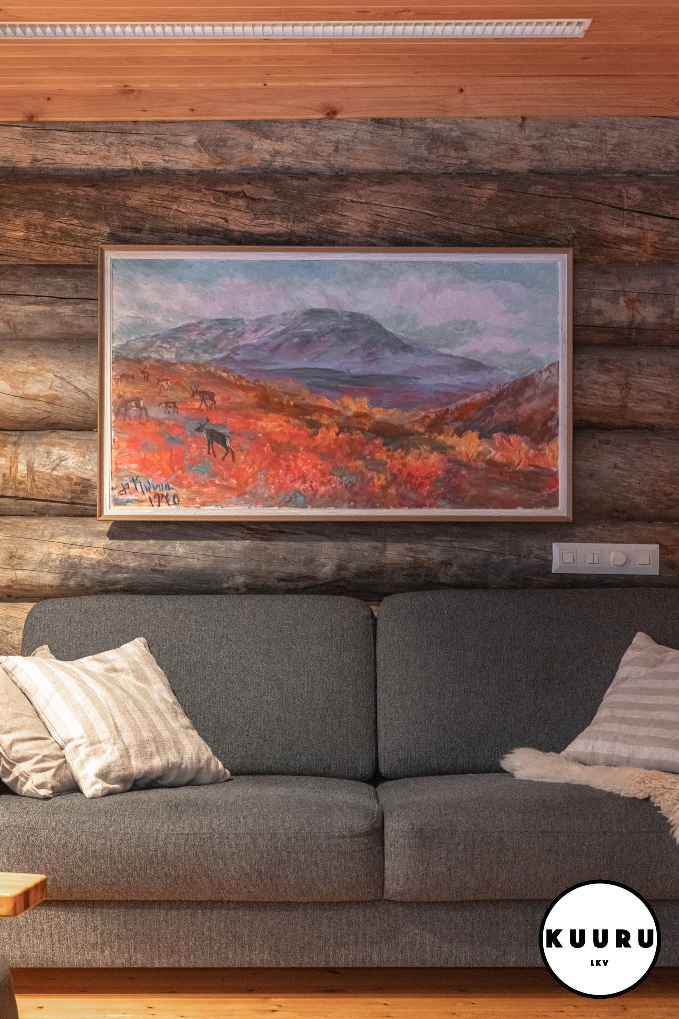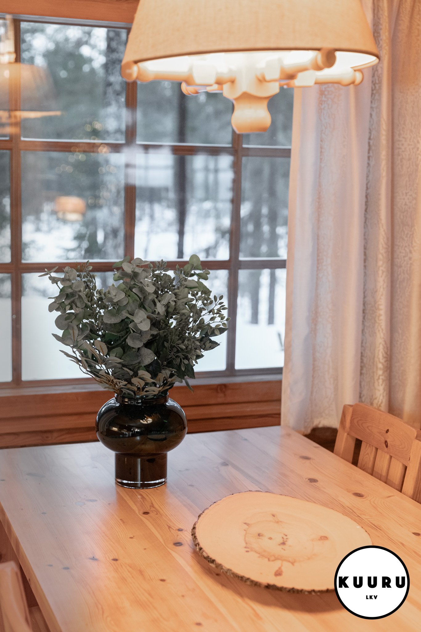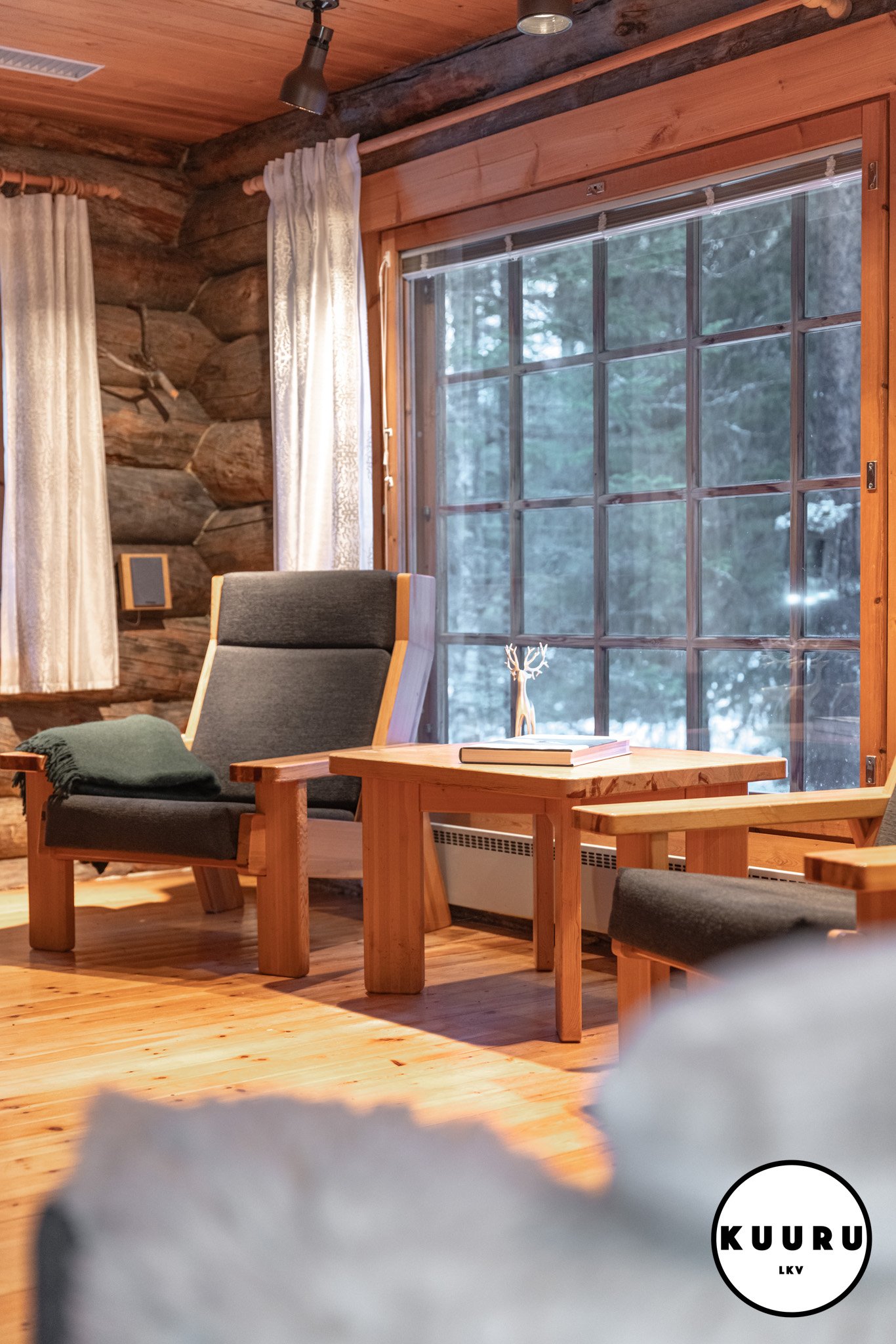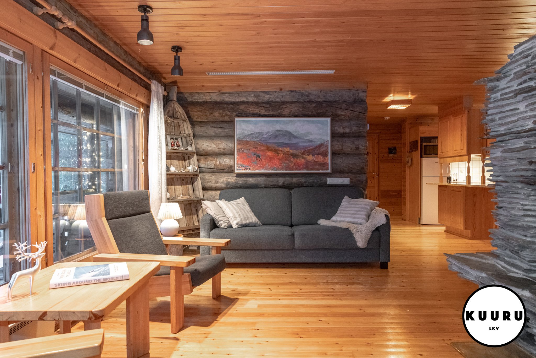 Kohteessa on avara olohuone, jossa on runsaasti ikkunoita, joista aukeaa upea maisema lammelle sekä pohjoissuomalaiseen kuusimetsään. Ikkunoiden määrä tuo valoa huoneeseen, joka tasapainottaa tummaa keloseinäistä materiaalia. Tänne on mukava kokoontua viettämään iltoja luonnonkivitakan ääreen iltojen hämärtyessä.