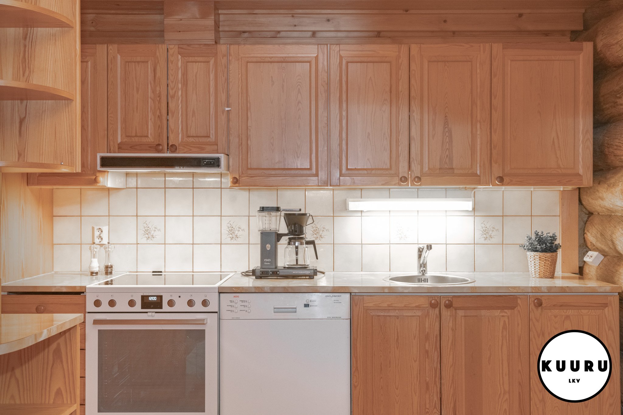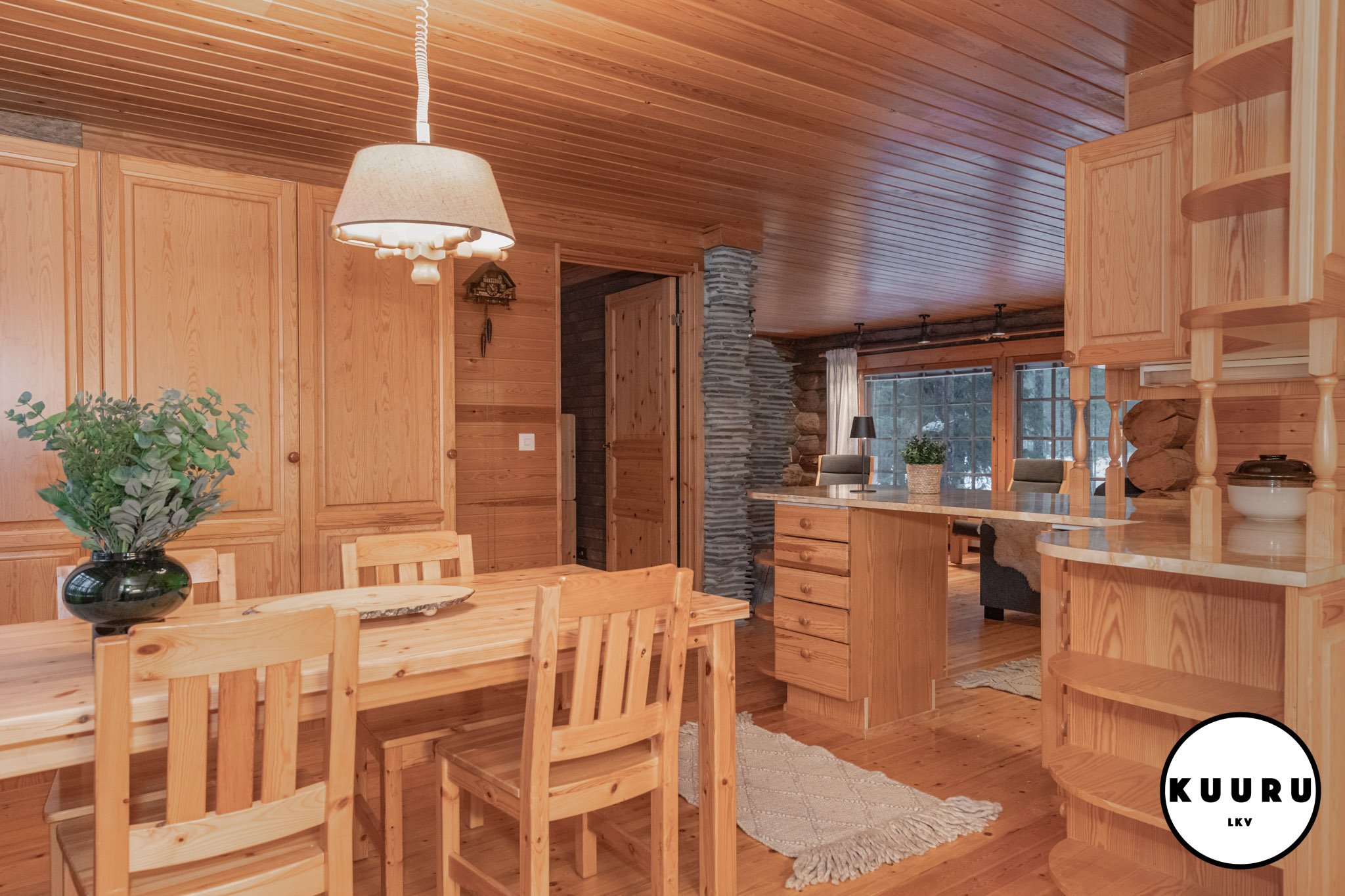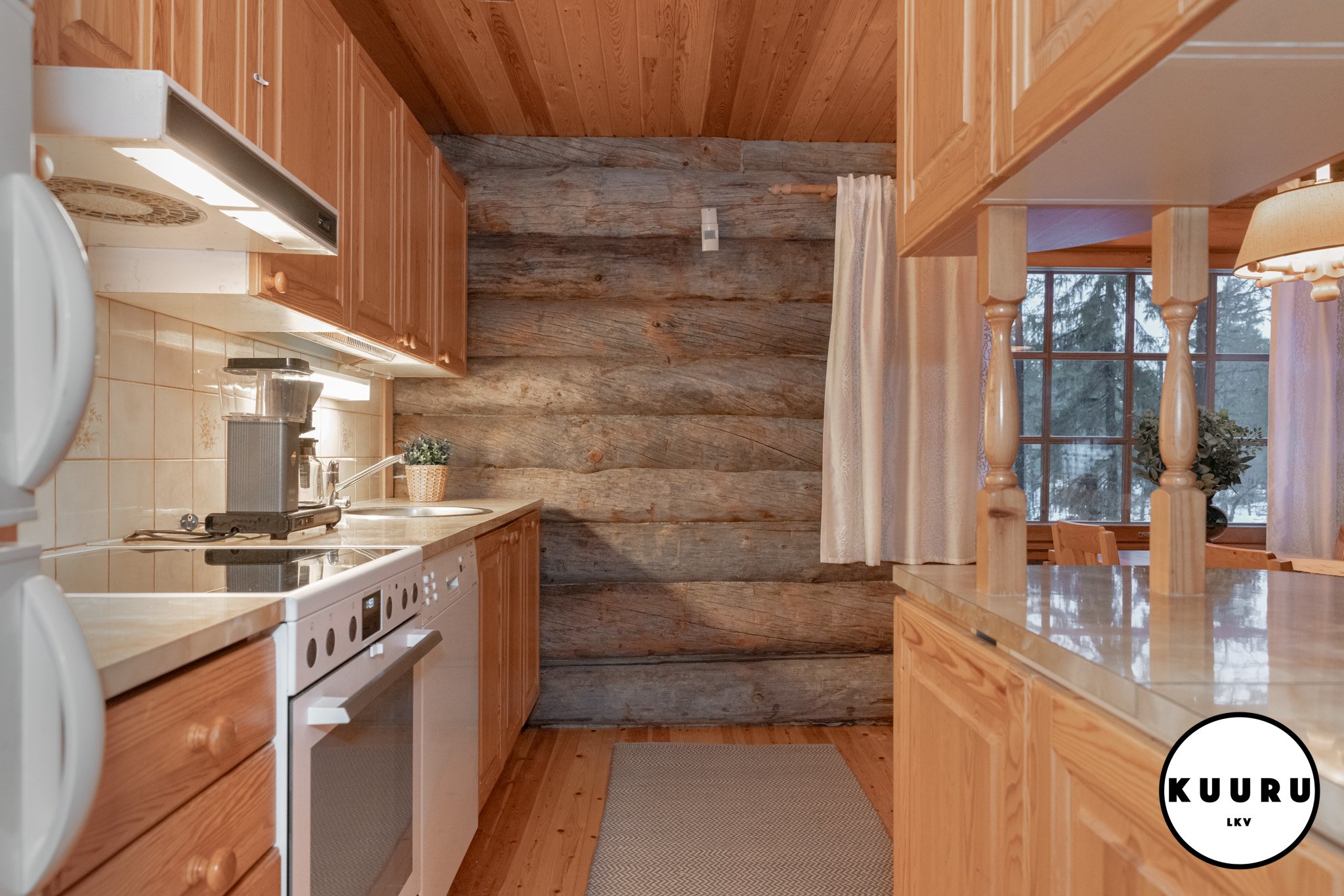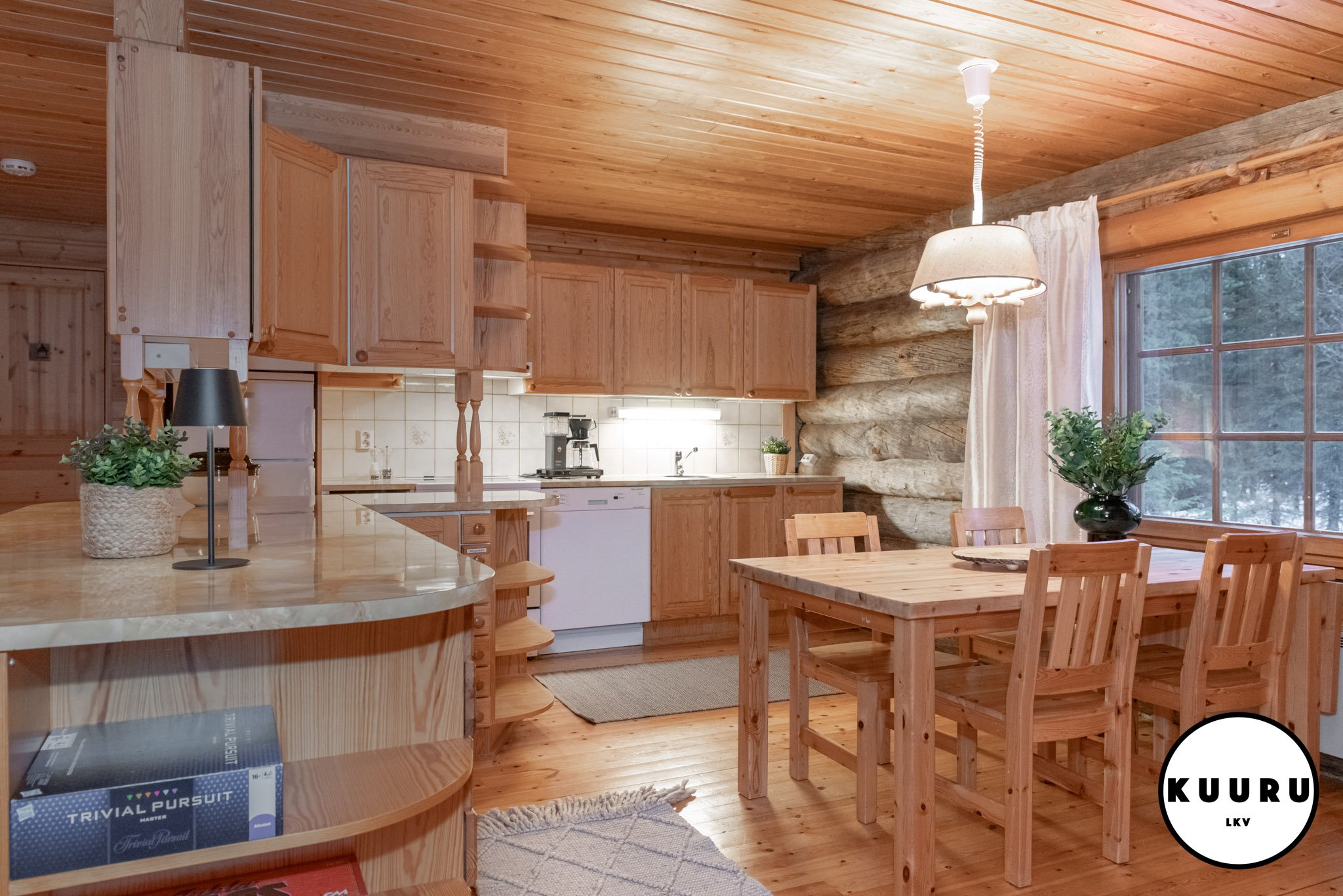 Kohteen avara keittiö tarjoaa runsaasti työskentelytilaa, mikä tekee ruoanlaitosta vaivatonta myös suuremmalle seurueelle. Keittiöstä ja ruokapöydän äärestä avautuvat rauhoittavat näkymät kauniiseen kuusimetsään.