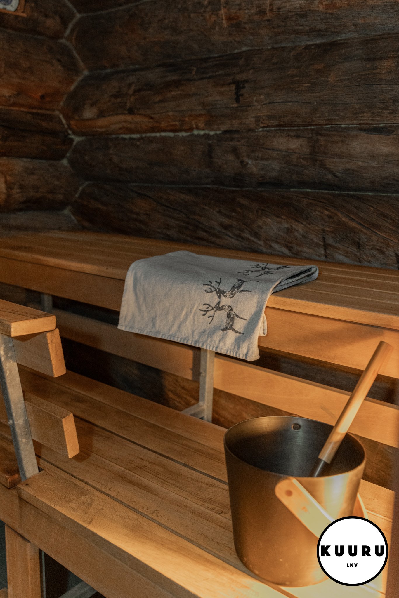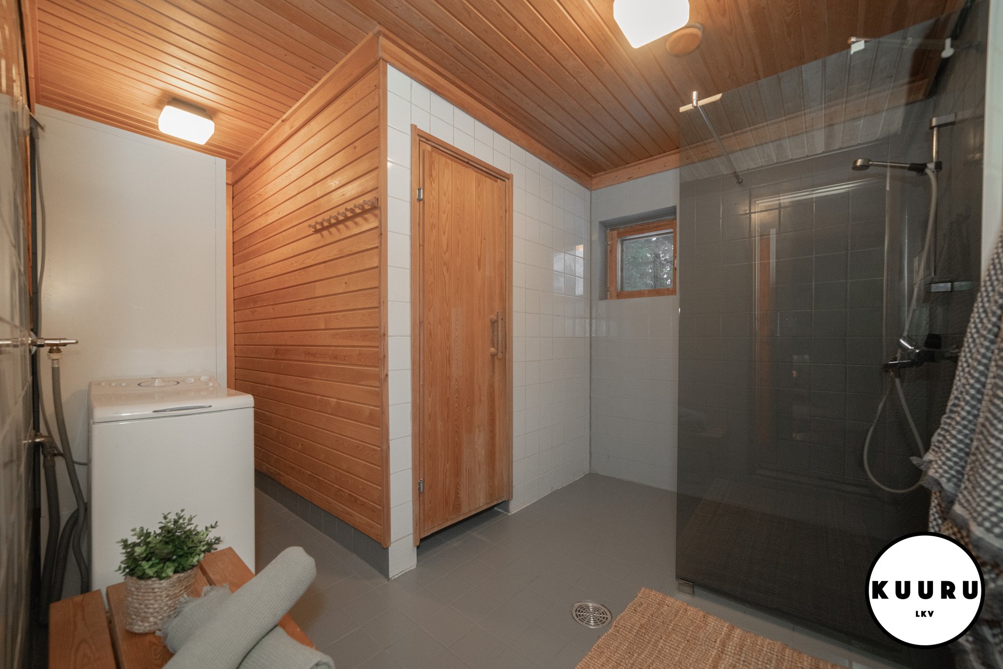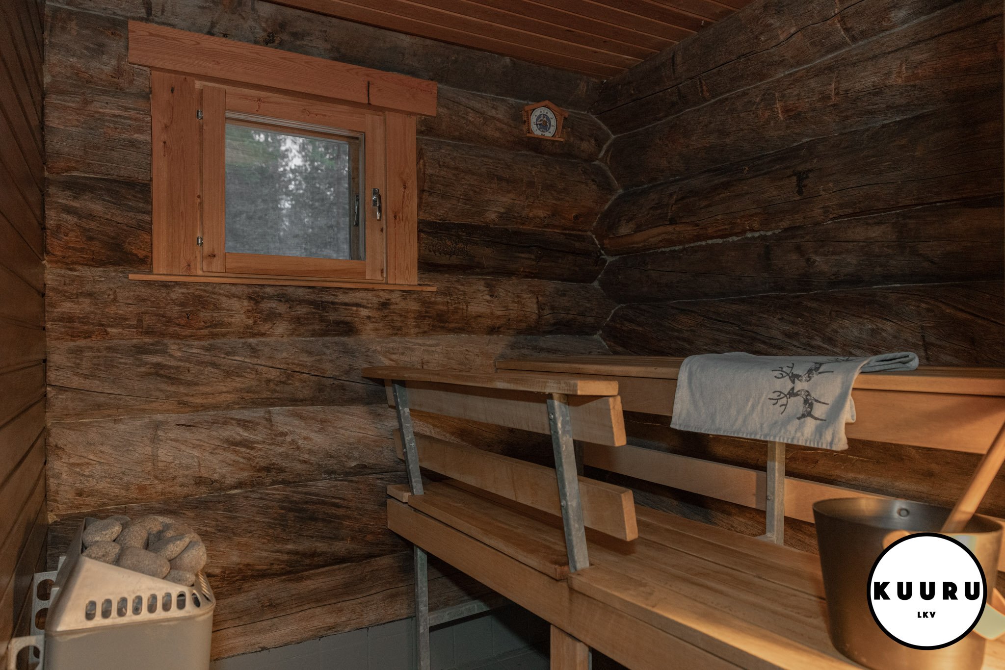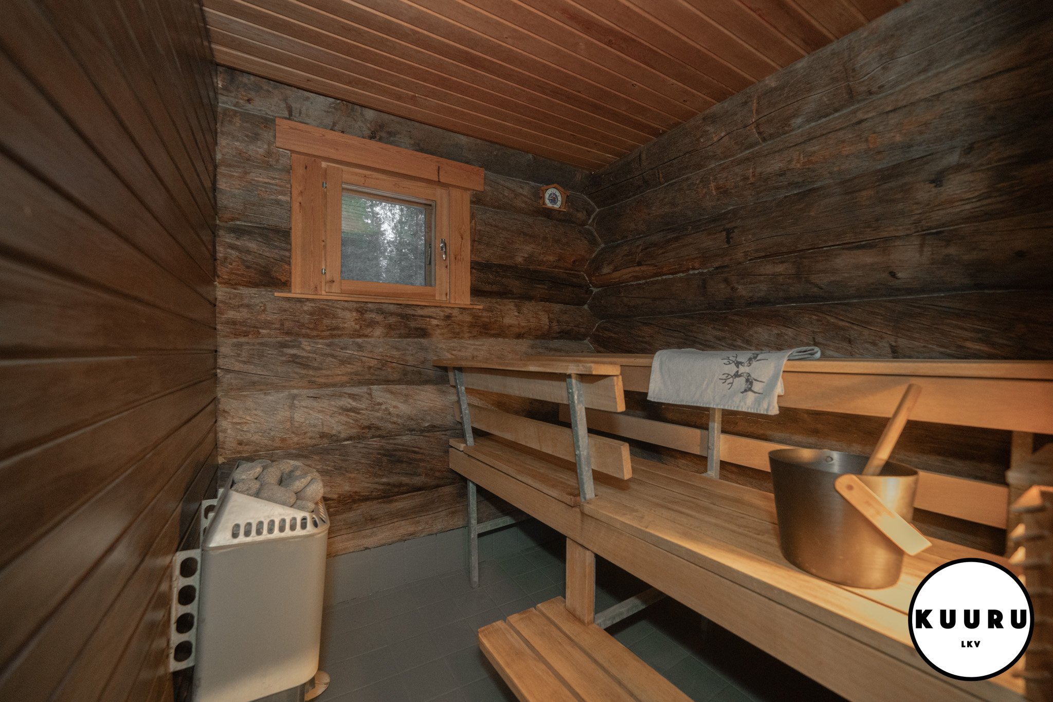 Kohteessa on tilava sauna, jonka kelomaiset seinät luovat pehmeän ja tunnelmallisen valaistuksen sekä aidon mökkimäisen ilmapiirin. Saunomisen yhteydessä on mahdollisuus pulahtaa virkistävään kivilampeen suoraan kiinteistöllä sijaitsevalta laiturilta.