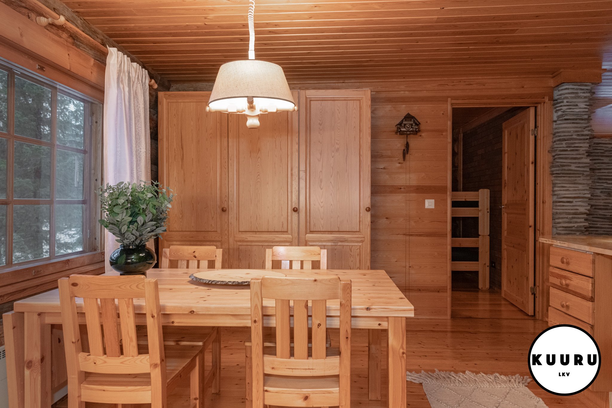 Vuonna 1987 rakennettu kelomökki on pidetty hyvässä kunnossa ja huokuu perinteistä mökkitunnelmaa. Avarasta olohuoneesta avautuvat suuret ikkunat kohti Kivilampea, tarjoten upeat maisemat kaikkina vuodenaikoina. Luonnonkivitakka tuo lämpöä ja viihtyisyyttä iltoihin, olipa kyseessä talvinen lomaviikko tai kesäinen irtiotto arjesta. Keittiö on tilava ja hyvin varusteltu, joten ruoanlaitto sujuu vaivattomasti myös isommalle seurueelle.